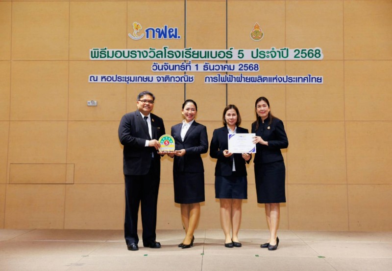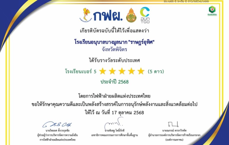 วันที่ 1 ธันวาคม 2568 ตัวแทนผู้บริหารและคณะครูกลุ่มสาระการเรียนรู้วิทยาศาสตร์และเทคโนโลยี โรงเรียนอนุบาลบางมูลนาก “ราษฎร์อุทิศ” เข้ารับรางวัลโล่และเกียรติบัตรระดับประเทศ โรงเรียนเบอร์ 5 ระดับ 5 ดาว ประจำปี 2568 ณ หอประชุมเกษม จาติกวณิช การไฟฟ้าฝ่ายผลิตแห่งประเทศไทย (สำนักงานกลาง) นนทบุรี มอบโดย นายวฤต รัตนชื่น รองผู้ว่าการยุทธศาสตร์ (รวย.) การไฟฟ้าฝ่ายผลิตแห่งประเทศไทย และ ดร.อาทิตยา ปัญญา ผู้อำนวยการสำนักพัฒนาวัตกรรมการจัดการศึกษา สพฐ.