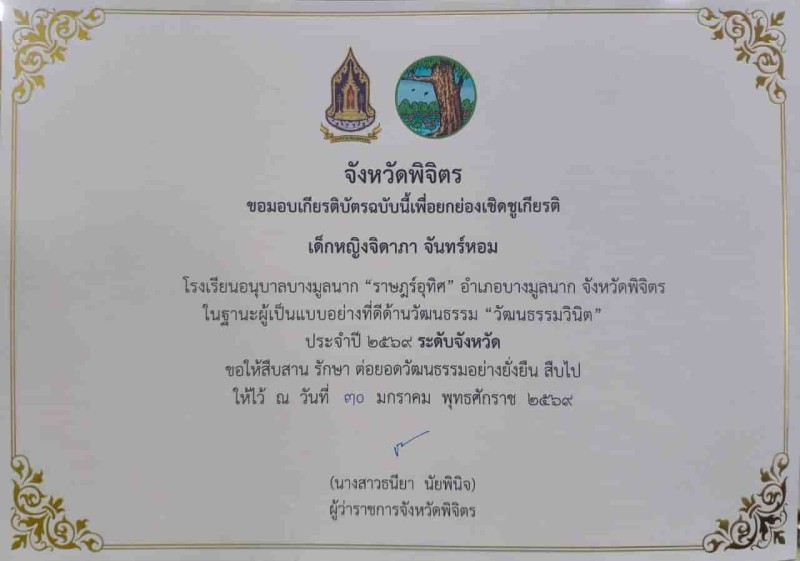 วันศุกร์ที่ 30 มกราคม พ.ศ.2569 นางสาวสุนันทา เพ็งแจ้ง รองผู้อำนวยการสถานศึกษา ได้รับมอบหมายจากผู้อำนวยการสถานศึกษานายดำรงค์เกียรติ โพธิ์พุก นำเด็กหญิงจิดาภา จันทร์หอม นักเรียนชั้นประถมศึกษาปีที่ 6 เข้ารับเกียรติบัตรยกย่องเชิดชูเกียรติ ในฐานะผู้เป็นแบบอย่างที่ดีด้านวัฒนธรรม"วัฒนธรรมวินิต"ประจำปี 2569 ระดับจังหวัด มอบโดยนายกิตติพล เวชกุล รองผู้ว่าราชการจังหวัดพิจิตร คราวประชุมคณะกรรมการจัดหวัดและหัวหน้าส่วนราชการประจำจังหวัดพิจิตรครั้งที่ 1/2569 ประจำเดือนมกราคม