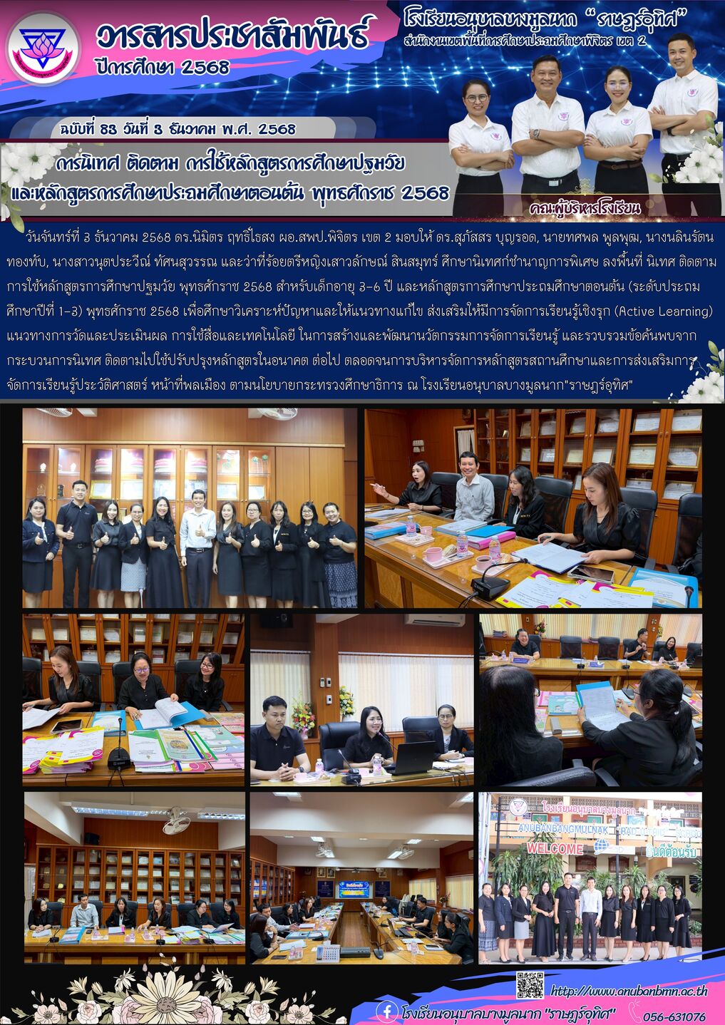 | วันจันทร์ที่ 3 ธันวาคม 2568 ดร.นิมิตร ฤทธิ์ไธสง ผอ.สพป.พิจิตร เขต 2 มอบให้ ดร.สุภัสสร บุญรอด, นายทศพล พูลพุฒ, นางนลินรัตน ทองทับ, นางสาวนุตประวีณ์ ทัศนสุวรรณ และว่าที่ร้อยตรีหญิงเสาวลักษณ์ สินสมุทร์ ศึกษานิเทศก์ชำนาญการพิเศษ ลงพื้นที่ นิเทศ ติดตาม การใช้หลักสูตรการศึกษาปฐมวัย พุทธศักราช 2568 สำหรับเด็กอายุ 3-6 ปี และหลักสูตรการศึกษาประถมศึกษาตอนต้น (ระดับประถมศึกษาปีที่ 1-3) พุทธศักราช 2568 เพื่อศึกษาวิเคราะห์ปัญหาและให้แนวทางแก้ไข ส่งเสริมให้มีการจัดการเรียนรู้เชิงรุก (Active Learning) แนวทางการวัดและประเมินผล การใช้สื่อและเทคโนโลยี ในการสร้างและพัฒนานวัตกรรมการจัดการเรียนรู้ และรวบรวมข้อค้นพบจากกระบวนการนิเทศ ติดตามไปใช้ปรับปรุงหลักสูตรในอนาคต ต่อไป ตลอดจนการบริหารจัดการหลักสูตรสถานศึกษาและการส่งเสริมการจัดการเรียนรู้ประวัติศาสตร์ หน้าที่พลเมือง ตามนโยบายกระทรวงศึกษาธิการ ณ โรงเรียนอนุบาลบางมูลนาก"ราษฎร์อุทิศ" |