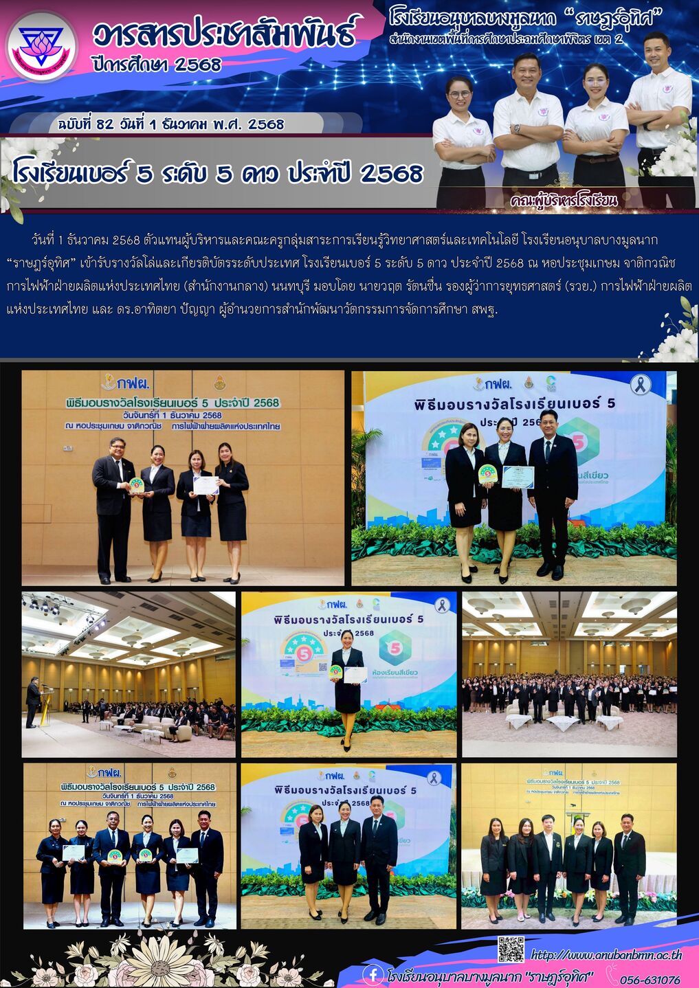| วันที่ 1 ธันวาคม 2568 ตัวแทนผู้บริหารและคณะครูกลุ่มสาระการเรียนรู้วิทยาศาสตร์และเทคโนโลยี โรงเรียนอนุบาลบางมูลนาก “ราษฎร์อุทิศ” เข้ารับรางวัลโล่และเกียรติบัตรระดับประเทศ โรงเรียนเบอร์ 5 ระดับ 5 ดาว ประจำปี 2568 ณ หอประชุมเกษม จาติกวณิช การไฟฟ้าฝ่ายผลิตแห่งประเทศไทย (สำนักงานกลาง) นนทบุรี มอบโดย นายวฤต รัตนชื่น รองผู้ว่าการยุทธศาสตร์ (รวย.) การไฟฟ้าฝ่ายผลิตแห่งประเทศไทย และ ดร.อาทิตยา ปัญญา ผู้อำนวยการสำนักพัฒนาวัตกรรมการจัดการศึกษา สพฐ. |