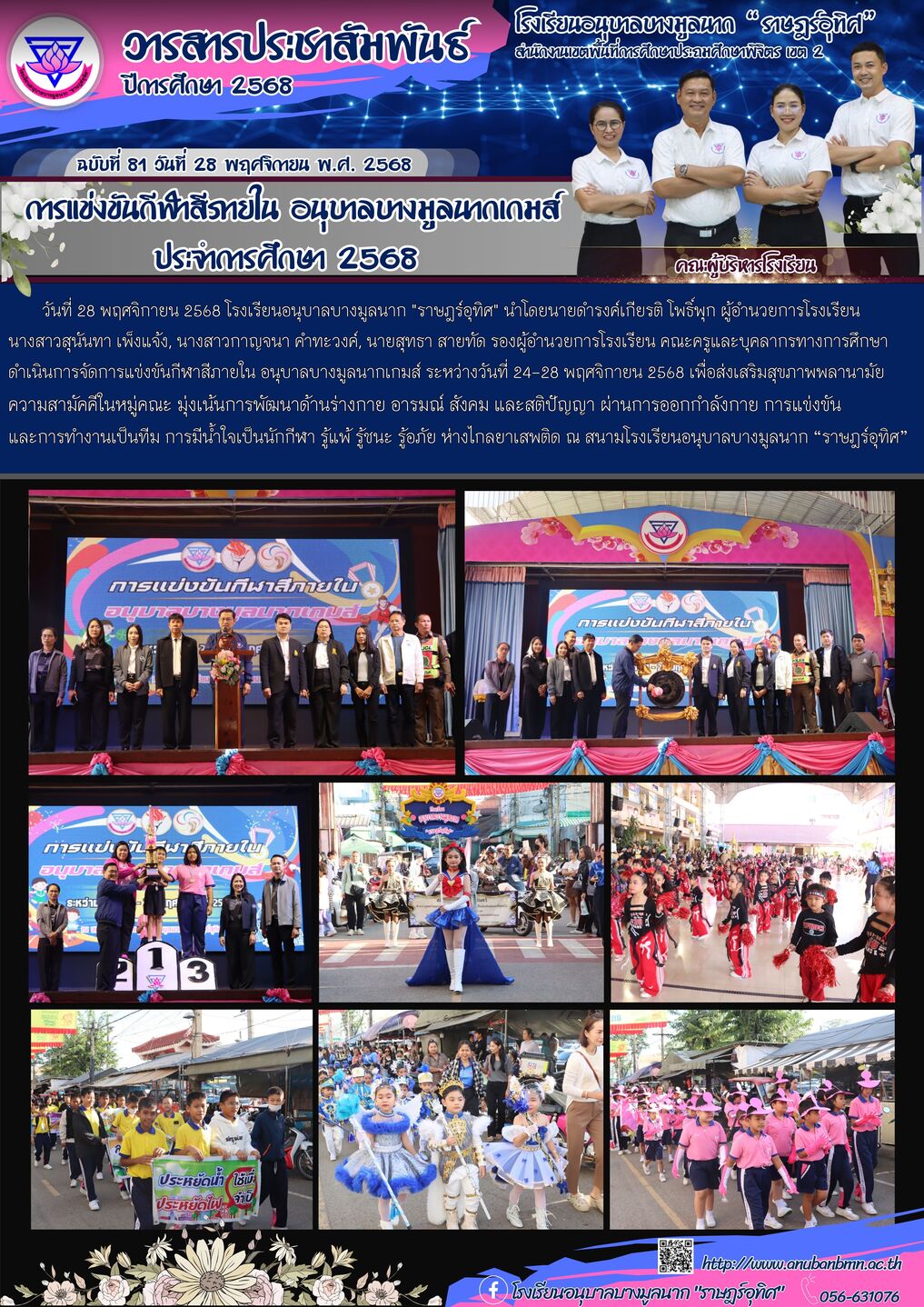 วันที่ 28 พฤศจิกายน 2568 โรงเรียนอนุบาลบางมูลนาก "ราษฎร์อุทิศ" นำโดยนายดำรงค์เกียรติ โพธิ์พุก ผู้อำนวยการโรงเรียน นางสาวสุนันทา เพ็งแจ้ง, นางสาวกาญจนา คำทะวงค์, นายสุทธา สายทัด รองผู้อำนวยการโรงเรียน คณะครูและบุคลากรทางการศึกษา ดำเนินการจัดการแข่งขันกีฬาสีภายใน อนุบาลบางมูลนากเกมส์ ระหว่างวันที่ 24-28 พฤศจิกายน 2568 เพื่อส่งเสริมสุขภาพพลานามัย ความสามัคคีในหมู่คณะ มุ่งเน้นการพัฒนาด้านร่างกาย อารมณ์ สังคม และสติปัญญา ผ่านการออกกำลังกาย การแข่งขันและการทำงานเป็นทีม การมีน้ำใจเป็นนักกีฬา รู้แพ้ รู้ชนะ รู้อภัย ห่างไกลยาเสพติด ณ สนามโรงเรียนอนุบาลบางมูลนาก “ราษฎร์อุทิศ” |