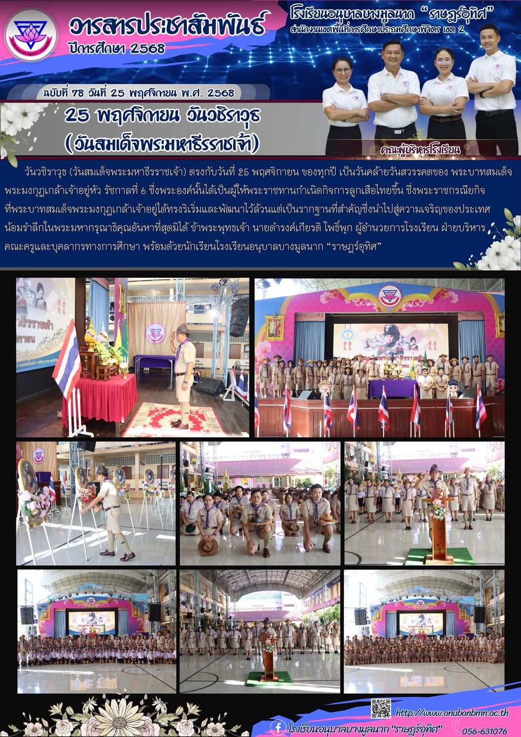 วันวชิราวุธ (วันสมเด็จพระมหาธีรราชเจ้า) ตรงกับวันที่ 25 พฤศจิกายน ของทุกปี เป็นวันคล้ายวันสวรรคตของ พระบาทสมเด็จพระมงกุฎเกล้าเจ้าอยู่หัว รัชกาลที่ 6 ซึ่งพระองค์นั้นได้เป็นผู้ให้พระราชทานกำเนิดกิจการลูกเสือไทยขึ้น ซึ่งพระราชกรณียกิจที่พระบาทสมเด็จพระมงกุฎเกล้าเจ้าอยู่ได้ทรงริเริ่มและพัฒนาไว้ล้วนแต่เป็นรากฐานที่สำคัญซึ่งนำไปสู่ความเจริญของประเทศน้อมรำลึกในพระมหากรุณาธิคุณอันหาที่สุดมิได้ ข้าพระพุทธเจ้า นายดำรงค์เกียรติ โพธิ์พุก ผู้อำนวยการโรงเรียน ฝ่ายบริหารคณะครูและบุคลากรทางการศึกษา พร้อมด้วยนักเรียนโรงเรียนอนุบาลบางมูลนาก “ราษฎร์อุทิศ” |