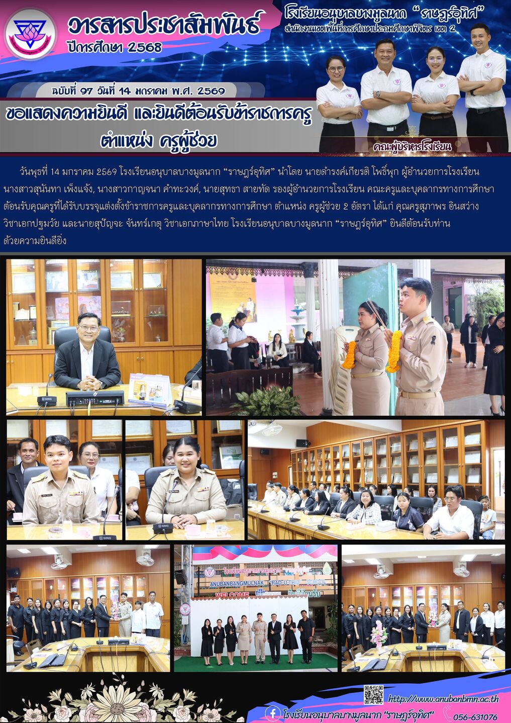 วันพุธที่ 14 มกราคม 2569 โรงเรียนอนุบาลบางมูลนาก “ราษฎร์อุทิศ” นำโดย นายดำรงค์เกียรติ โพธิ์พุก ผู้อำนวยการโรงเรียน นางสาวสุนันทา เพ็งแจ้ง, นางสาวกาญจนา คำทะวงค์, นายสุทธา สายทัด รองผู้อำนวยการโรงเรียน คณะครูและบุคลากรทางการศึกษา ต้อนรับคุณครูที่ได้รับบรรจุแต่งตั้งข้าราชการครูและบุคลากรทางการศึกษา ตำแหน่ง ครูผู้ช่วย 2 อัตรา ได้แก่ คุณครูสุภาพร อินสว่าง วิชาเอกปฐมวัย และนายสุปัญจะ จันทร์เกตุ วิชาเอกภาษาไทย โรงเรียนอนุบาลบางมูลนาก “ราษฎร์อุทิศ” ยินดีต้อนรับท่าน ด้วยความยินดียิ่ง |
