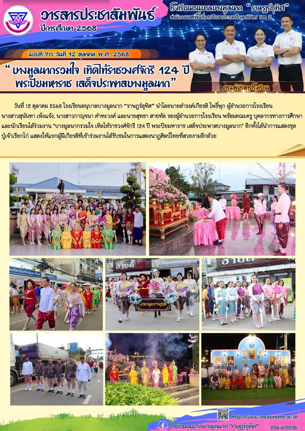 วันที่ 12 ตุลาคม 2568 โรงเรียนอนุบาลบางมูลนาก “ราษฎร์อุทิศ” นำโดยนายดำรงค์เกียรติ โพธิ์พุก ผู้อำนวยการโรงเรียน นางสาวสุนันทา เพ็งแจ้ง, นางสาวกาญจนา คำทะวงค์ และนายสุทธา สายทัด รองผู้อำนวยการโรงเรียน พร้อมคณะครู บุคลากรทางการศึกษา และนักเรียนได้ร่วมงาน "บางมูลนากรวมใจ เทิดไท้ราชวงศ์จักรี 124 ปี พระปิยมหาราช เสด็จประพาสบางมูลนาก" อีกทั้งได้นำการแสดงชุดปู่เจ้าเรียกไก่ แสดงให้แขกผู้มีเกียรติที่เข้าร่วมงานได้รับชมในการแสดงนาฏศิลป์ไทยที่สวยงามอีกด้วย |
