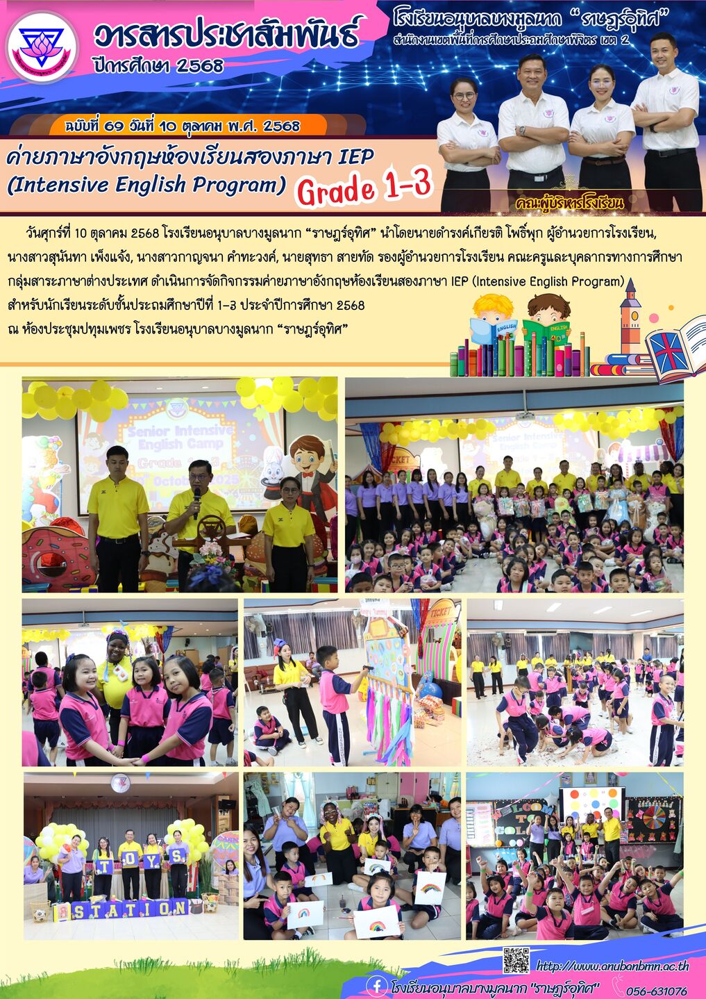 วันศุกร์ที่ 10 ตุลาคม 2568 โรงเรียนอนุบาลบางมูลนาก “ราษฎร์อุทิศ” นำโดยนายดำรงค์เกียรติ โพธิ์พุก ผู้อำนวยการโรงเรียน, นางสาวสุนันทา เพ็งแจ้ง, นางสาวกาญจนา คำทะวงค์, นายสุทธา สายทัด รองผู้อำนวยการโรงเรียน คณะครูและบุคลากรทางการศึกษา กลุ่มสาระภาษาต่างประเทศ ดำเนินการจัดกิจกรรมค่ายภาษาอังกฤษห้องเรียนสองภาษา IEP (Intensive English Program) สำหรับนักเรียนระดับชั้นประถมศึกษาปีที่ 1-3 ประจำปีการศึกษา 2568 ณ ห้องประชุมปทุมเพชร โรงเรียนอนุบาลบางมูลนาก “ราษฎร์อุทิศ” |