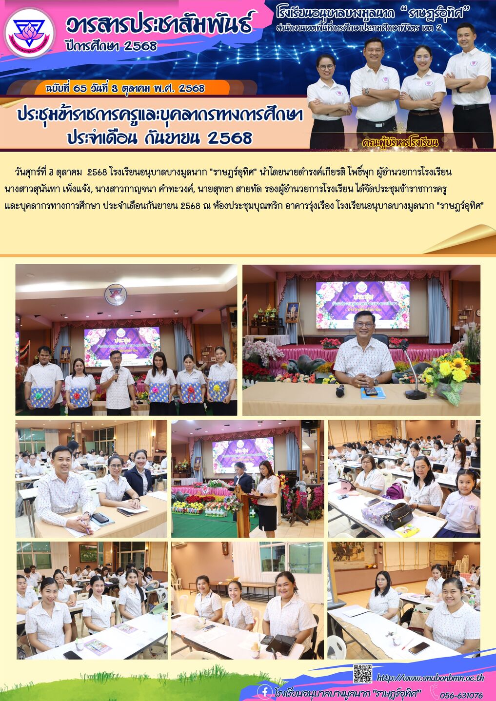 วันศุกร์ที่ 3 ตุลาคม 2568 โรงเรียนอนุบาลบางมูลนาก "ราษฎร์อุทิศ" นำโดยนายดำรงค์เกียรติ โพธิ์พุก ผู้อำนวยการโรงเรียน นางสาวสุนันทา เพ็งแจ้ง, นางสาวกาญจนา คำทะวงค์, นายสุทธา สายทัด รองผู้อำนวยการโรงเรียน ได้จัดประชุมข้าราชการครูและบุคลากรทางการศึกษา ประจำเดือนกันยายน 2568 ณ ห้องประชุมบุณฑริก อาคารรุ่งเรือง โรงเรียนอนุบาลบางมูลนาก "ราษฎร์อุทิศ" |