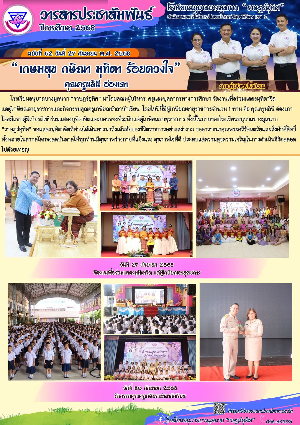 โรงเรียนอนุบาลบางมูลนาก “ราษฎร์อุทิศ” นำโดยคณะผู้บริหาร, ครูและบุคลากรทางการศึกษา จัดงานเพื่อร่วมแสดงมุทิตาจิต แด่ผู้เกษียณอายุราชการและกิจกรรมคุณครูเกษียณอำลานักเรียน โดยในปีนี้มีผู้เกษียณอายุราชการจำนวน 1 ท่าน คือ คุณครูนลินี อ่องเภา โดยมีแขกผู้มีเกียรติเข้าร่วมแสดงมุทิตาจิตและมอบของที่ระลึกแด่ผู้เกษียณอายุราชการ ทั้งนี้ในนามของโรงเรียนอนุบาลบางมูลนาก “ราษฎร์อุทิศ” ขอแสดงมุทิตาจิตที่ท่านได้เดินทางมาถึงเส้นชัยของชีวิตราชการอย่างสง่างาม ขออาราธนาคุณพระศรีรัตนตรัยและสิ่งศักดิ์สิทธิ์ทั้งหลายในสากลโลกจงดลบันดาลให้ทุกท่านมีสุขภาพร่างกายที่แข็งแรง สุขภาพใจที่ดี ประสบแต่ความสุขความเจริญในการดำเนินชีวิตตลอดไปด้วยเทอญ |