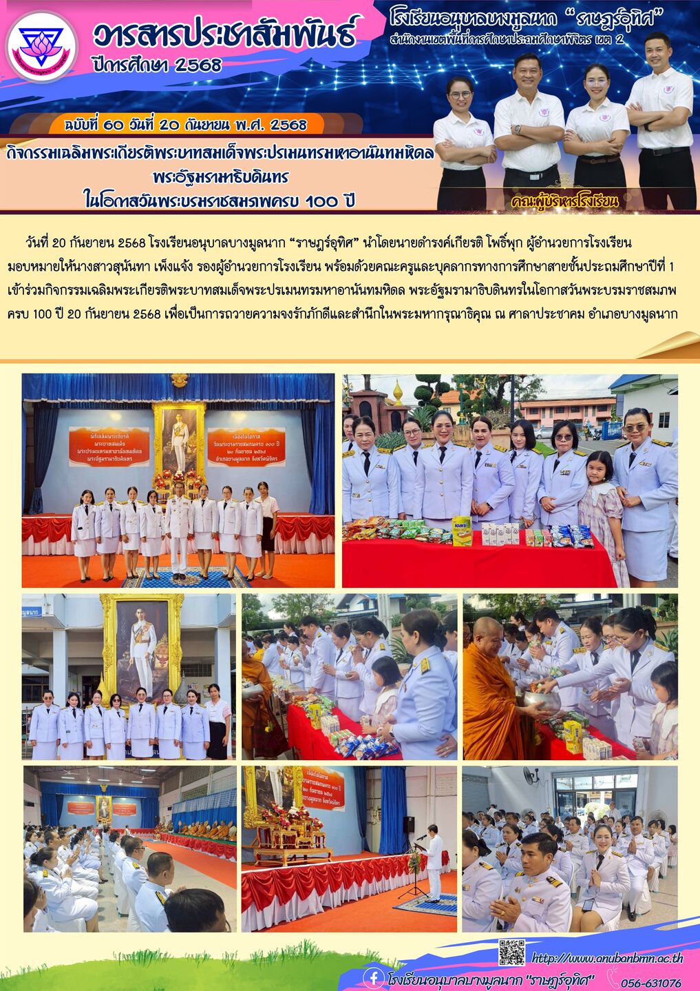 วันที่ 20 กันยายน 2568 โรงเรียนอนุบาลบางมูลนาก “ราษฎร์อุทิศ” นำโดยนายดำรงค์เกียรติ โพธิ์พุก ผู้อำนวยการโรงเรียน มอบหมายให้นางสาวสุนันทา เพ็งแจ้ง รองผู้อำนวยการโรงเรียน พร้อมด้วยคณะครูและบุคลากรทางการศึกษาสายชั้นประถมศึกษาปีที่ 1 เข้าร่วมกิจกรรมเฉลิมพระเกียรติพระบาทสมเด็จพระปรเมนทรมหาอานันทมหิดล พระอัฐมรามาธิบดินทรในโอกาสวันพระบรมราชสมภพครบ 100 ปี 20 กันยายน 2568 เพื่อเป็นการถวายความจงรักภักดีและสำนึกในพระมหากรุณาธิคุณ ณ ศาลาประชาคม อำเภอบางมูลนาก |