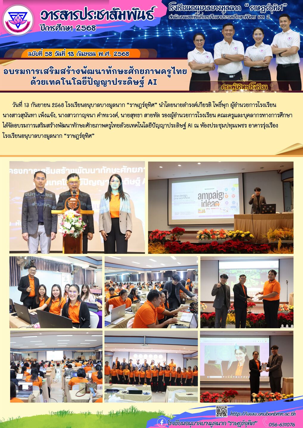 วันที่ 13 กันยายน 2568 โรงเรียนอนุบาลบางมูลนาก “ราษฎร์อุทิศ” นำโดยนายดำรงค์เกียรติ โพธิ์พุก ผู้อำนวยการโรงเรียน นางสาวสุนันทา เพ็งแจ้ง, นางสาวกาญจนา คำทะวงค์, นายสุทธา สายทัด รองผู้อำนวยการโรงเรียน คณะครูและบุคลากรทางการศึกษา ได้จัดอบรมการเสริมสร้างพัฒนาทักษะศักยภาพครูไทยด้วยเทคโนโลยีปัญญาประดิษฐ์ AI ณ ห้องประชุมปทุมเพชร อาคารรุ่งเรือง โรงเรียนอนุบาลบางมูลนาก “ราษฎร์อุทิศ” |