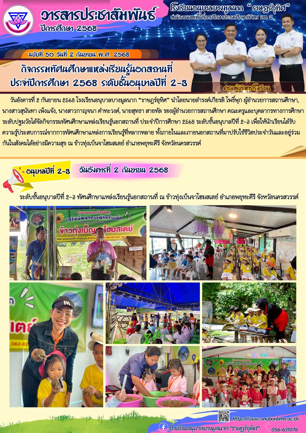 | วันอังคารที่ 2 กันยายน 2568 โรงเรียนอนุบาลบางมูลนาก “ราษฎร์อุทิศ” นำโดยนายดำรงค์เกียรติ โพธิ์พุก ผู้อำนวยการสถานศึกษา, นางสาวสุนันทา เพ็งแจ้ง, นางสาวกาญจนา คำทะวงค์, นายสุทธา สายทัด รองผู้อำนวยการสถานศึกษา คณะครูและบุคลากรทางการศึกษาระดับปฐมวัยได้จัดกิจกรรมทัศนศึกษาแหล่งเรียนรู้นอกสถานที่ ประจำปีการศึกษา 2568 ระดับชั้นอนุบาลปีที่ 2-3 เพื่อให้นักเรียนได้รับความรู้ประสบการณ์จากการทัศนศึกษาแหล่งการเรียนรู้ที่หลากหลาย ทั้งภายในและภายนอกสถานที่มาปรับใช้ชีวิตประจำวันและอยู่ร่วมกันในสังคมได้อย่างมีความสุข ณ ข้าวทุ่งเบ็นจาโฮมสเตย์ อำเภอพยุหะคีรี จังหวัดนครสวรรค์ |