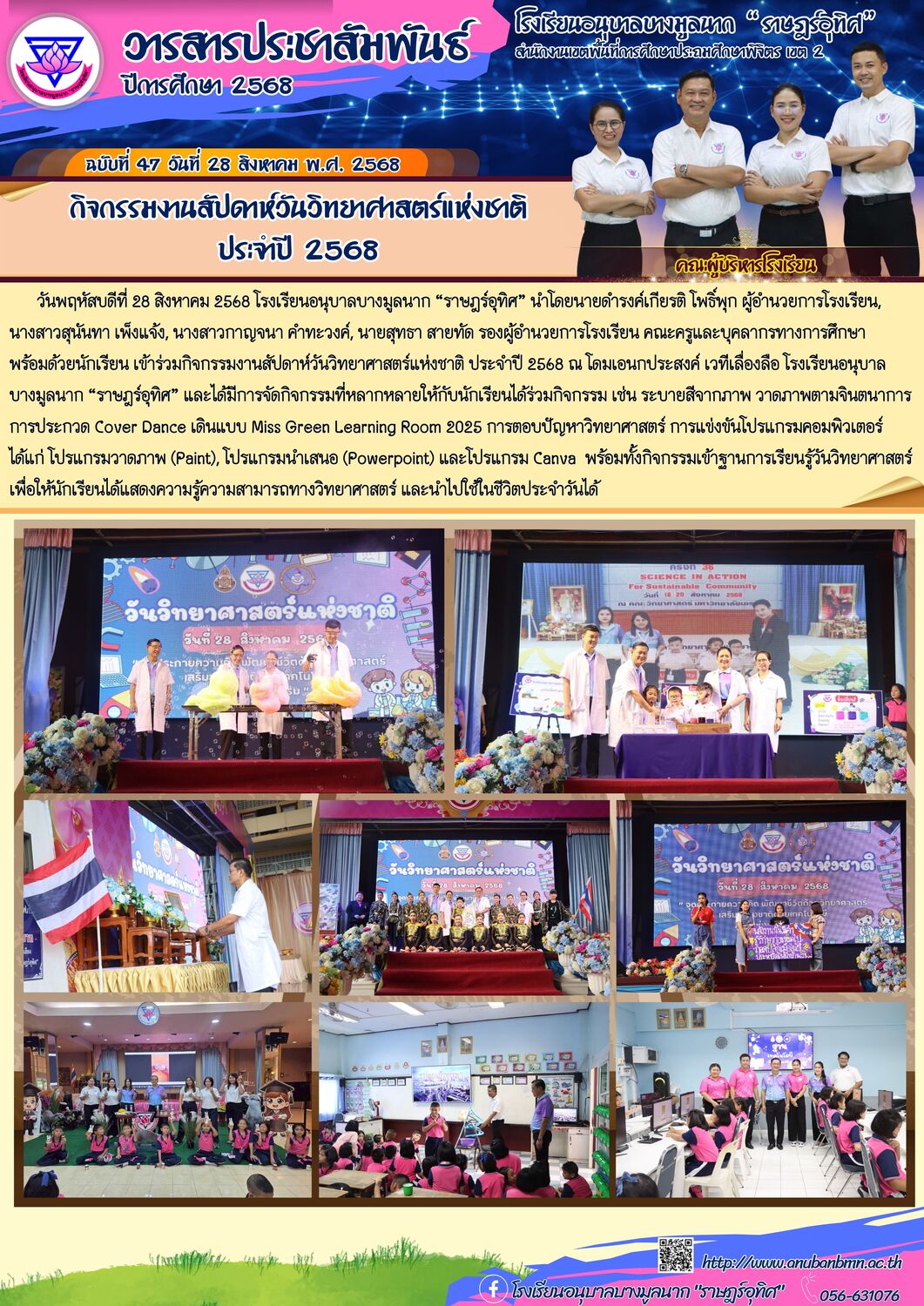 วันพฤหัสบดีที่ 28 สิงหาคม 2568 โรงเรียนอนุบาลบางมูลนาก “ราษฎร์อุทิศ” นำโดยนายดำรงค์เกียรติ โพธิ์พุก ผู้อำนวยการโรงเรียน, นางสาวสุนันทา เพ็งแจ้ง, นางสาวกาญจนา คำทะวงค์, นายสุทธา สายทัด รองผู้อำนวยการโรงเรียน คณะครูและบุคลากรทางการศึกษาพร้อมด้วยนักเรียน เข้าร่วมกิจกรรมงานสัปดาห์วันวิทยาศาสตร์แห่งชาติ ประจำปี 2568 ณ โดมเอนกประสงค์ เวทีเลื่องลือ โรงเรียนอนุบาลบางมูลนาก “ราษฎร์อุทิศ” และได้มีการจัดกิจกรรมที่หลากหลายให้กับนักเรียนได้ร่วมกิจกรรม เช่น ระบายสีจากภาพ วาดภาพตามจินตนาการ การประกวด Cover Dance เดินแบบ Miss Green Learning Room 2025 การตอบปัญหาวิทยาศาสตร์ การแข่งขันโปรแกรมคอมพิวเตอร์ ได้แก่ โปรแกรมวาดภาพ (Paint), โปรแกรมนำเสนอ (Powerpoint) และโปรแกรม Canva พร้อมทั้งกิจกรรมเข้าฐานการเรียนรู้วันวิทยาศาสตร์ เพื่อให้นักเรียนได้แสดงความรู้ความสามารถทางวิทยาศาสตร์ และนำไปใช้ในชีวิตประจำวันได้ |