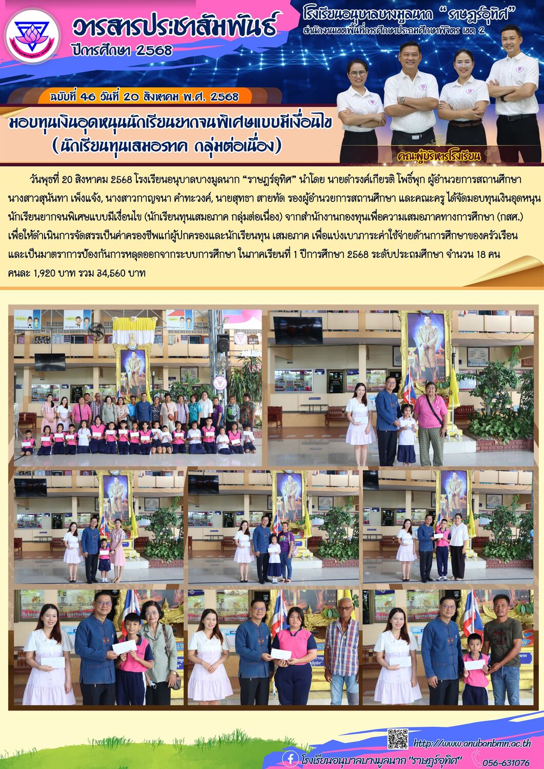 วันพุธที่ 20 สิงหาคม 2568 โรงเรียนอนุบาลบางมูลนาก “ราษฎร์อุทิศ” นำโดย นายดำรงค์เกียรติ โพธิ์พุก ผู้อำนวยการสถานศึกษา นางสาวสุนันทา เพ็งแจ้ง, นางสาวกาญจนา คำทะวงค์, นายสุทธา สายทัด รองผู้อำนวยการสถานศึกษา และคณะครู ได้จัดมอบทุนเงินอุดหนุนนักเรียนยากจนพิเศษแบบมีเงื่อนไข (นักเรียนทุนเสมอภาค กลุ่มต่อเนื่อง) จากสำนักงานกองทุนเพื่อความเสมอภาคทางการศึกษา (กสศ.) เพื่อให้ดำเนินการจัดสรรเป็นค่าครองชีพแก่ผู้ปกครองและนักเรียนทุน เสมอภาค เพื่อแบ่งเบาภาระค่าใช้จ่ายด้านการศึกษาของครัวเรือน และเป็นมาตราการป้องกันการหลุดออกจากระบบการศึกษา ในภาคเรียนที่ 1 ปีการศึกษา 2568 ระดับประถมศึกษา จำนวน 18 คน คนละ 1,920 บาท รวม 34,560 บาท |