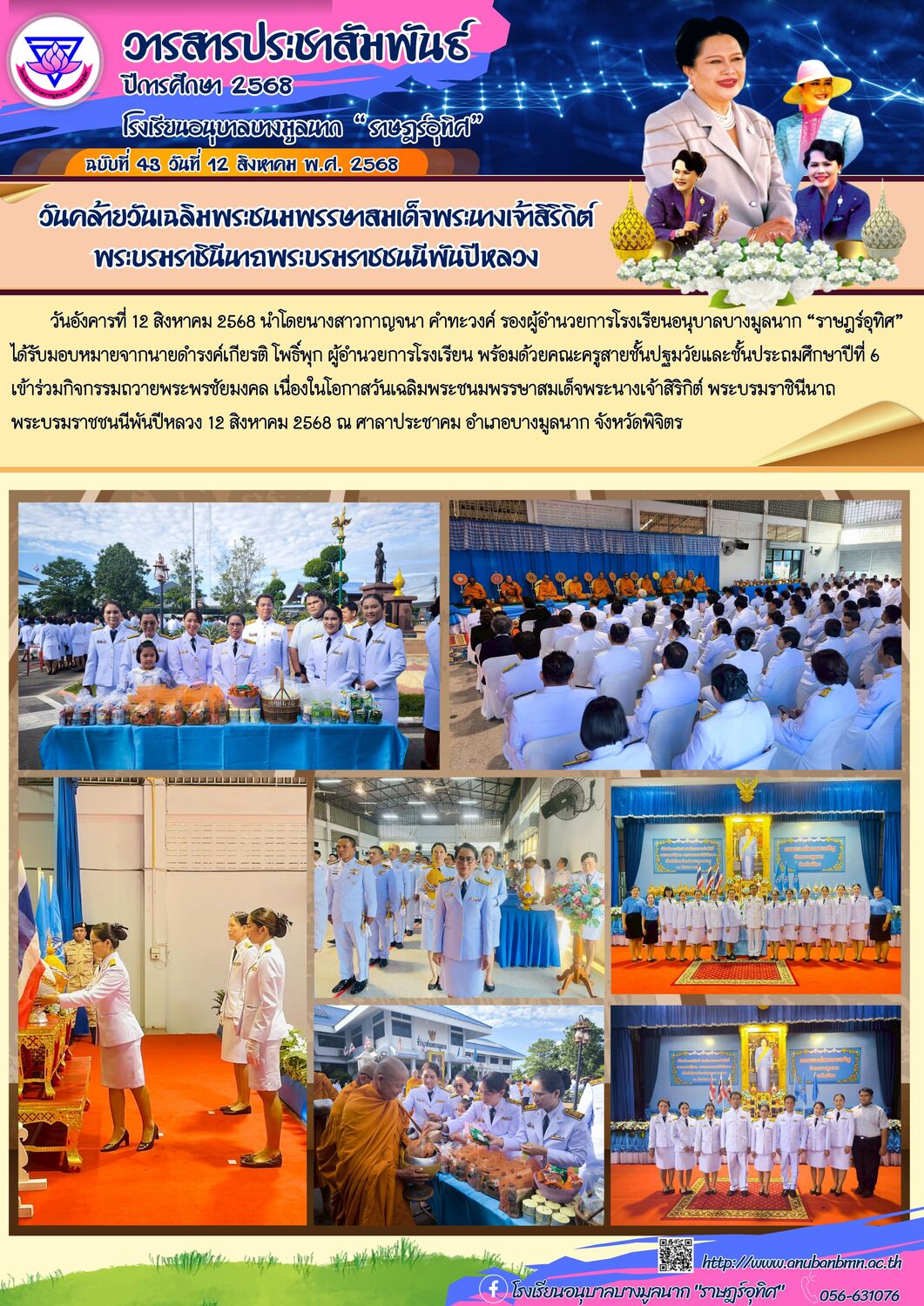 วันอังคารที่ 12 สิงหาคม 2568 นำโดยนางสาวกาญจนา คำทะวงค์ รองผู้อำนวยการโรงเรียนอนุบาลบางมูลนาก “ราษฎร์อุทิศ” ได้รับมอบหมายจากนายดำรงค์เกียรติ โพธิ์พุก ผู้อำนวยการโรงเรียน พร้อมด้วยคณะครูสายชั้นปฐมวัยและชั้นประถมศึกษาปีที่ 6 เข้าร่วมกิจกรรมถวายพระพรชัยมงคล เนื่องในโอกาสวันเฉลิมพระชนมพรรษาสมเด็จพระนางเจ้าสิริกิต์ พระบรมราชินีนาถ พระบรมราชชนนีพันปีหลวง 12 สิงหาคม 2568 ณ ศาลาประชาคม อำเภอบางมูลนาก จังหวัดพิจิตร |