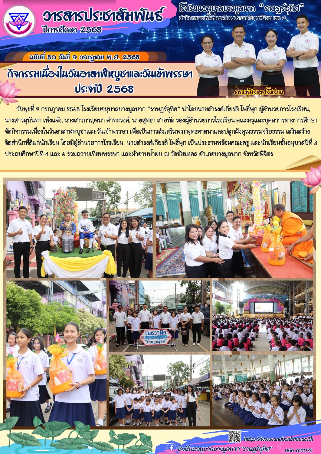 วันพุธที่ 9 กรกฎาคม 2568 โรงเรียนอนุบาลบางมูลนาก “ราษฎร์อุทิศ” นำโดยนายดำรงค์เกียรติ โพธิ์พุก ผู้อำนวยการโรงเรียน, นางสาวสุนันทา เพ็งแจ้ง, นางสาวกาญจนา คำทะวงค์, นายสุทธา สายทัด รองผู้อำนวยการโรงเรียน คณะครูและบุคลากรทางการศึกษา จัดกิจกรรมเนื่องในวันอาสาฬหบูชาและวันเข้าพรรษา เพื่อเป็นการส่งเสริมพระพุทธศาสนาและปลูกฝังคุณธรรมจริยธรรม เสริมสร้างจิตสำนึกที่ดีแก่นักเรียน โดยมีผู้อำนวยการโรงเรียน นายดำรงค์เกียรติ โพธิ์พุก เป็นประธานพร้อมคณะครู และนักเรียนชั้นอนุบาลปีที่ 3 ประถมศึกษาปีที่ 4 และ 6 ร่วมถวายเทียนพรรษา และผ้าอาบน้ำฝน ณ วัดชัยมงคล อำเภอบางมูลนาก จังหวัดพิจิตร |