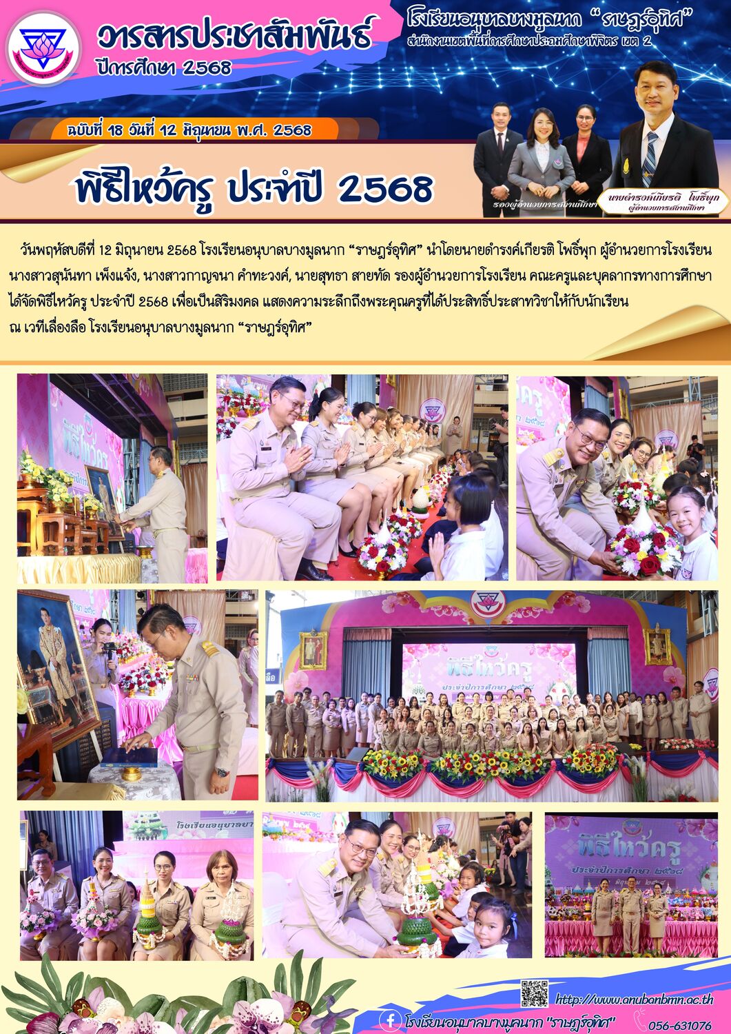 วันพฤหัสบดีที่ 12 มิถุนายน 2568 โรงเรียนอนุบาลบางมูลนาก “ราษฎร์อุทิศ” นำโดยนายดำรงค์เกียรติ โพธิ์พุก ผู้อำนวยการโรงเรียน นางสาวสุนันทา เพ็งแจ้ง, นางสาวกาญจนา คำทะวงค์, นายสุทธา สายทัด รองผู้อำนวยการโรงเรียน คณะครูและบุคลากรทางการศึกษา ได้จัดพิธีไหว้ครู ประจำปี 2568 เพื่อเป็นสิริมงคล แสดงความระลึกถึงพระคุณครูที่ได้ประสิทธิ์ประสาทวิชาให้กับนักเรียน ณ เวทีเลื่องลือ โรงเรียนอนุบาลบางมูลนาก “ราษฎร์อุทิศ” |