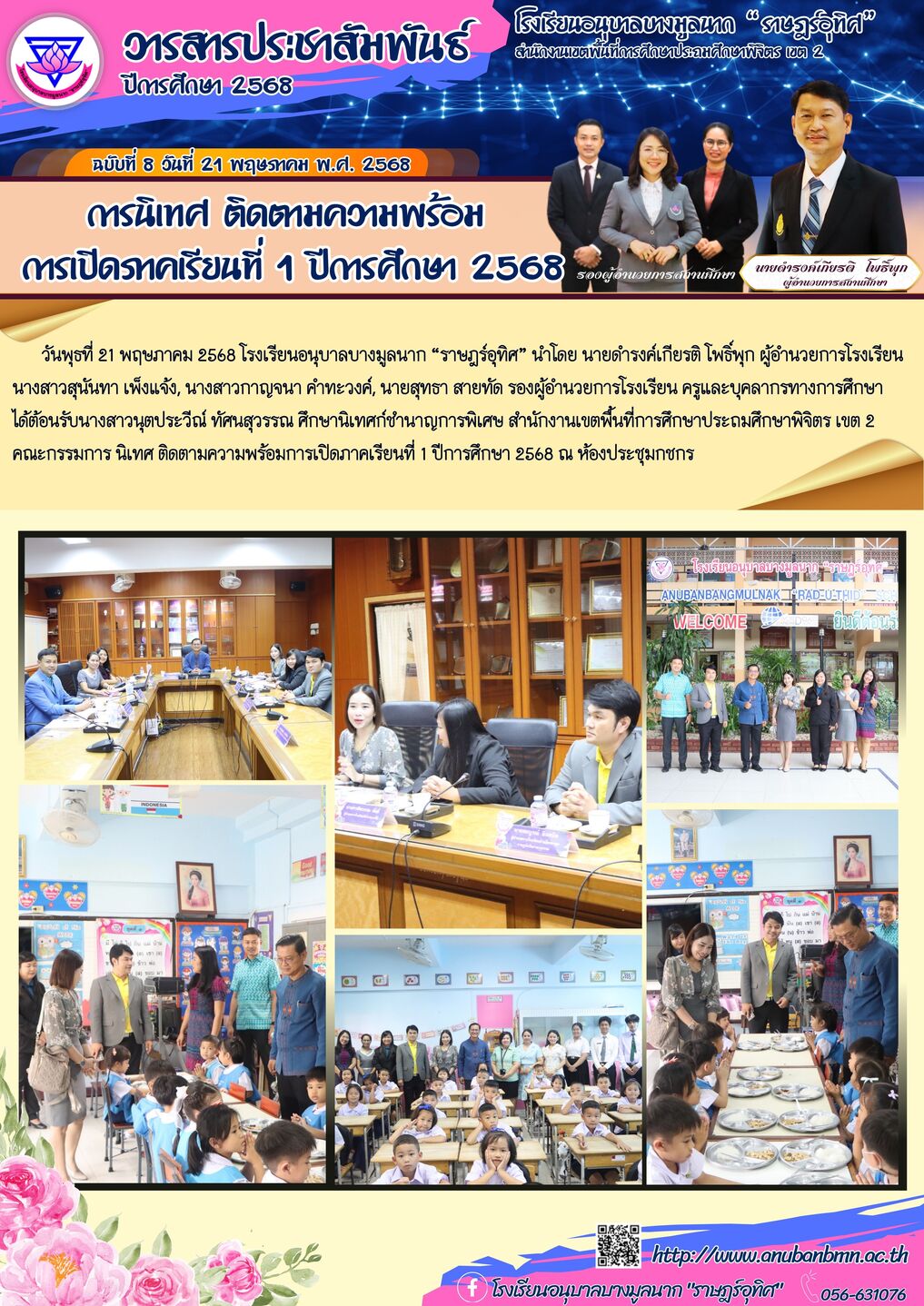 วันพุธที่ 21 พฤษภาคม 2568 โรงเรียนอนุบาลบางมูลนาก “ราษฎร์อุทิศ” นำโดย นายดำรงค์เกียรติ โพธิ์พุก ผู้อำนวยการโรงเรียน นางสาวสุนันทา เพ็งแจ้ง, นางสาวกาญจนา คำทะวงค์, นายสุทธา สายทัด รองผู้อำนวยการโรงเรียน ครูและบุคลากรทางการศึกษา ได้ต้อนรับนางสาวนุตประวีณ์ ทัศนสุวรรณ ศึกษานิเทศก์ชำนาญการพิเศษ สำนักงานเขตพื้นที่การศึกษาประถมศึกษาพิจิตร เขต 2 คณะกรรมการ นิเทศ ติดตามความพร้อมการเปิดภาคเรียนที่ 1 ปีการศึกษา 2568 ณ ห้องประชุมกชกร |