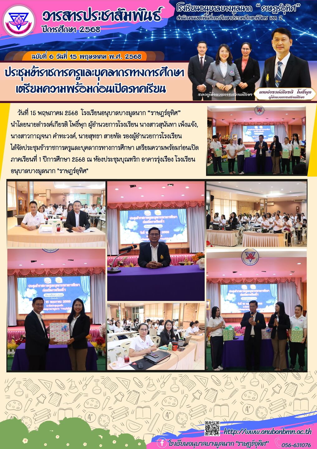 วันที่ 15 พฤษภาคม 2568 โรงเรียนอนุบาลบางมูลนาก “ราษฎร์อุทิศ” นำโดยนายดำรงค์เกียรติ โพธิ์พุก ผู้อำนวยการโรงเรียน นางสาวสุนันทา เพ็งแจ้ง, นางสาวกาญจนา คำทะวงค์, นายสุทธา สายทัด รองผู้อำนวยการโรงเรียน ได้จัดประชุมข้าราชการครูและบุคลากรทางการศึกษา เตรียมความพร้อมก่อนเปิดภาคเรียนที่ 1 ปีการศึกษา 2568 ณ ห้องประชุมบุณฑริก อาคารรุ่งเรือง โรงเรียนอนุบาลบางมูลนาก "ราษฎร์อุทิศ" |