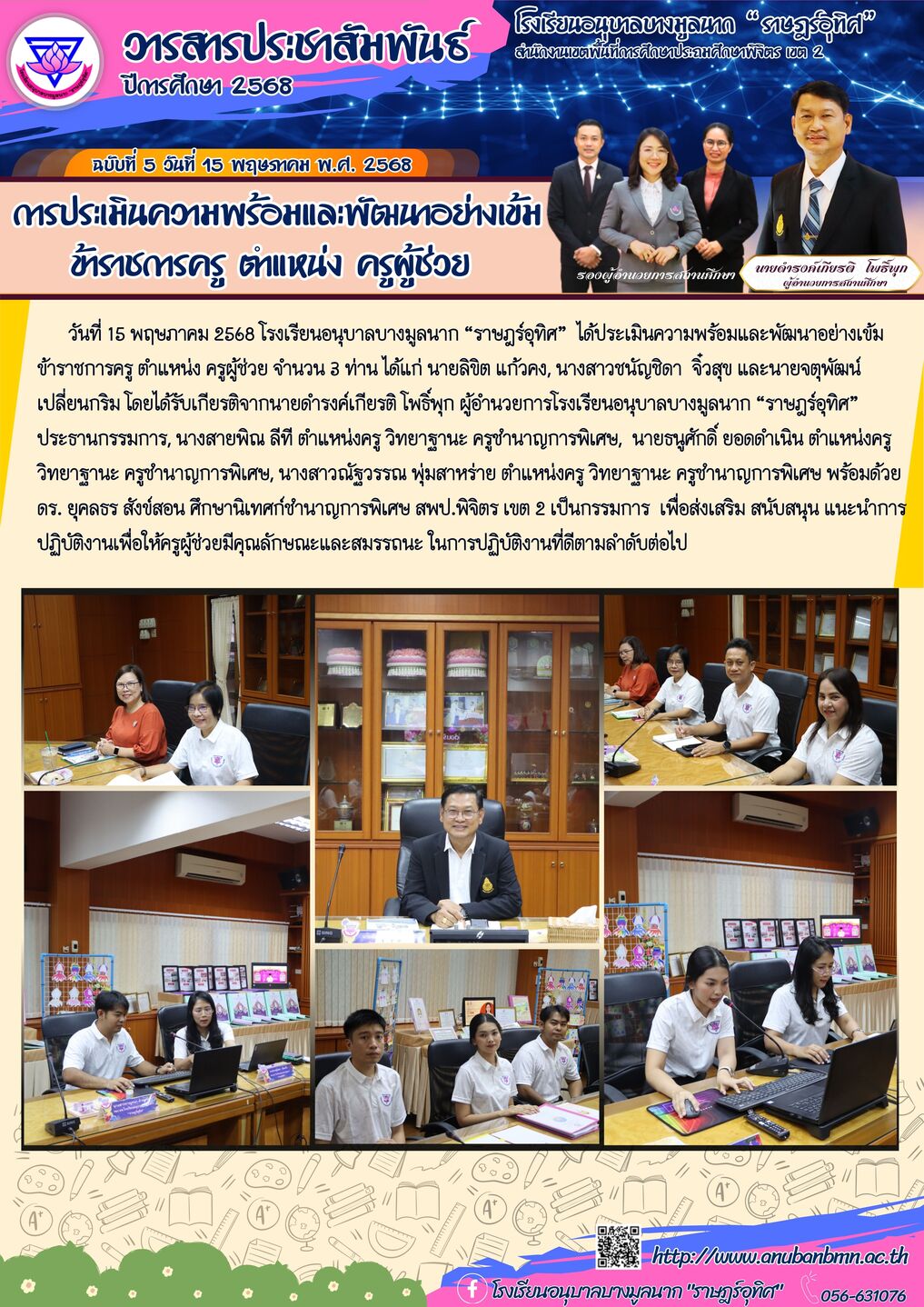 วันที่ 15 พฤษภาคม 2568 โรงเรียนอนุบาลบางมูลนาก “ราษฎร์อุทิศ” ได้ประเมินความพร้อมและพัฒนาอย่างเข้มข้าราชการครู ตำแหน่ง ครูผู้ช่วย จำนวน 3 ท่าน ได้แก่ นายลิขิต แก้วคง, นางสาวชนัญชิดา จิ๋วสุข และนายจตุพัฒน์ เปลี่ยนกริม โดยได้รับเกียรติจากนายดำรงค์เกียรติ โพธิ์พุก ผู้อำนวยการโรงเรียนอนุบาลบางมูลนาก “ราษฎร์อุทิศ” ประธานกรรมการ, นางสายพิณ ลีที ตำแหน่งครู วิทยาฐานะ ครูชำนาญการพิเศษ, นายธนูศักดิ์ ยอดดำเนิน ตำแหน่งครู วิทยาฐานะ ครูชำนาญการพิเศษ, นางสาวณัฐวรรณ พุ่มสาหร่าย ตำแหน่งครู วิทยาฐานะ ครูชำนาญการพิเศษ พร้อมด้วย ดร. ยุคลธร สังข์สอน ศึกษานิเทศก์ชำนาญการพิเศษ สพป.พิจิตร เขต 2 เป็นกรรมการ เพื่อส่งเสริม สนับสนุน แนะนำการปฏิบัติงานเพื่อให้ครูผู้ช่วยมีคุณลักษณะและสมรรถนะ ในการปฏิบัติงานที่ดีตามลำดับต่อไป |