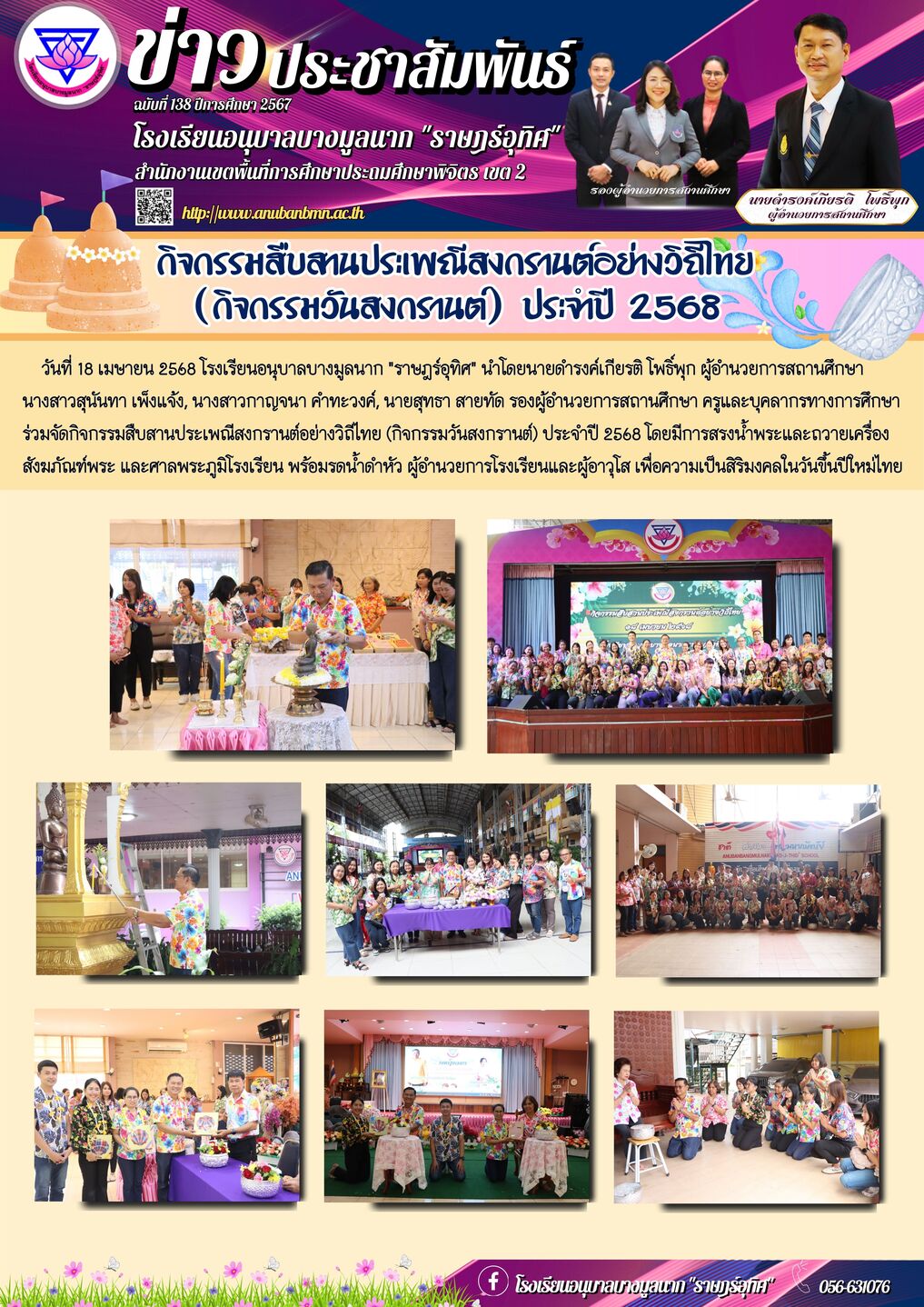 | วันที่ 18 เมษายน 2568 โรงเรียนอนุบาลบางมูลนาก "ราษฎร์อุทิศ" นำโดยนายดำรงค์เกียรติ โพธิ์พุก ผู้อำนวยการสถานศึกษา นางสาวสุนันทา เพ็งแจ้ง, นางสาวกาญจนา คำทะวงค์, นายสุทธา สายทัด รองผู้อำนวยการสถานศึกษา ครูและบุคลากรทางการศึกษา ร่วมจัดกิจกรรมสืบสานประเพณีสงกรานต์อย่างวิถีไทย (กิจกรรมวันสงกรานต์) ประจำปี 2568 โดยมีการสรงน้ำพระและถวายเครื่องสังฆภัณฑ์พระ และศาลพระภูมิโรงเรียน พร้อมรดน้ำดำหัว ผู้อำนวยการโรงเรียนและผู้อาวุโส เพื่อความเป็นสิริมงคลในวันขึ้นปีใหม่ไทย |