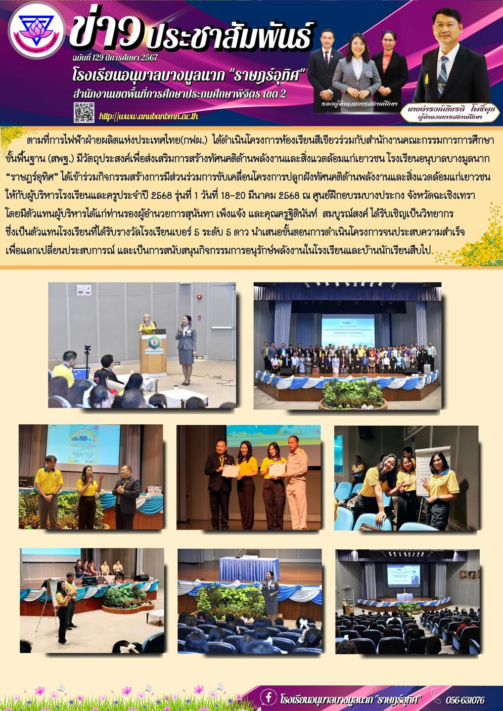 ตามที่การไฟฟ้าฝ่ายผลิตแห่งประเทศไทย(กฟผ.) ได้ดำเนินโครงการห้องเรียนสีเขียวร่วมกับสำนักงานคณะกรรมการการศึกษาขั้นพื้นฐาน (สพฐ.) มีวัตถุประสงค์เพื่อส่งเสริมการสร้างทัศนคติด้านพลังงานและสิ่งแวดล้อมแก่เยาวชน โรงเรียนอนุบาลบางมูลนาก “ราษฎร์อุทิศ” ได้เข้าร่วมกิจกรรมสร้างการมีส่วนร่วมการขับเคลื่อนโครงการปลูกฝังทัศนคติด้านพลังงานและสิ่งแวดล้อมแก่เยาวชนให้กับผู้บริหารโรงเรียนและครูประจำปี 2568 รุ่นที่ 1 วันที่ 18-20 มีนาคม 2568 ณ ศูนย์ฝึกอบรมบางประกง จังหวัดฉะเชิงเทรา โดยมีตัวแทนผู้บริหารได้แก่ท่านรองผู้อำนวยการสุนันทา เพ็งแจ้ง และคุณครูฐิตินันท์ สมบูรณ์สงค์ ได้รับเชิญเป็นวิทยากร ซึ่งเป็นตัวแทนโรงเรียนที่ได้รับรางวัลโรงเรียนเบอร์ 5 ระดับ 5 ดาว นำเสนอขั้นตอนการดำเนินโครงการจนประสบความสำเร็จ เพื่อแลกเปลี่ยนประสบการณ์ และเป็นการสนับสนุนกิจกรรมการอนุรักษ์พลังงานในโรงเรียนและบ้านนักเรียนสืบไป |
