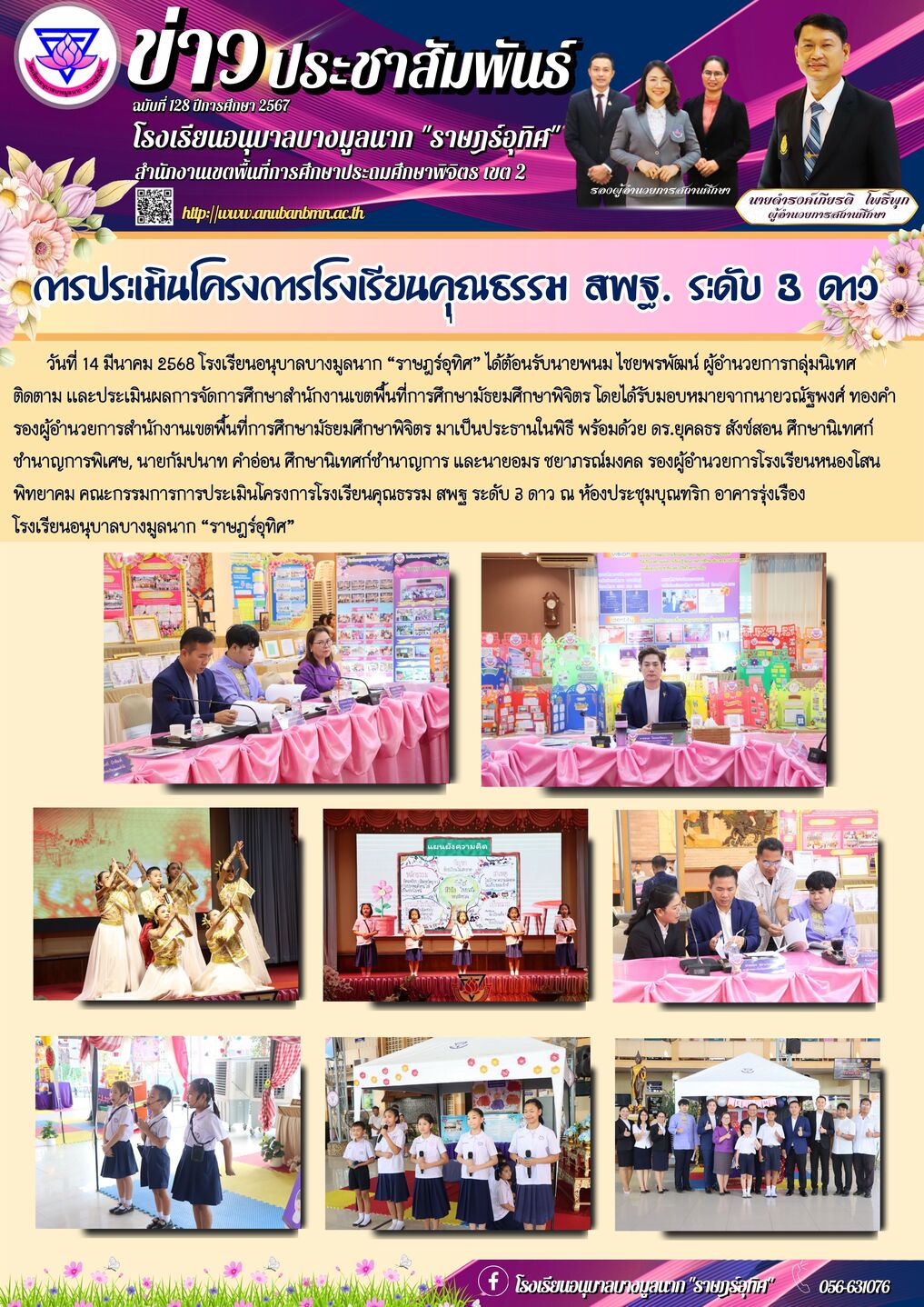 วันที่ 14 มีนาคม 2568 โรงเรียนอนุบาลบางมูลนาก “ราษฎร์อุทิศ” ได้ต้อนรับนายพนม ไชยพรพัฒน์ ผู้อำนวยการกลุ่มนิเทศ ติดตาม เเละประเมินผลการจัดการศึกษาสำนักงานเขตพื้นที่การศึกษามัธยมศึกษาพิจิตร โดยได้รับมอบหมายจากนายวณัฐพงศ์ ทองคำ รองผู้อำนวยการสำนักงานเขตพื้นที่การศึกษามัธยมศึกษาพิจิตร มาเป็นประธานในพิธี พร้อมด้วย ดร.ยุคลธร สังข์สอน ศึกษานิเทศก์ชำนาญการพิเศษ, นายกัมปนาท คำอ่อน ศึกษานิเทศก์ชำนาญการ และนายอมร ชยาภรณ์มงคล รองผู้อำนวยการโรงเรียนหนองโสนพิทยาคม คณะกรรมการการประเมินโครงการโรงเรียนคุณธรรม สพฐ ระดับ 3 ดาว ณ ห้องประชุมบุณฑริก อาคารรุ่งเรือง โรงเรียนอนุบาลบางมูลนาก “ราษฎร์อุทิศ” |
