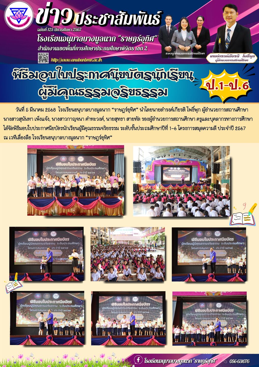 วันที่ 5 มีนาคม 2568 โรงเรียนอนุบาลบางมูลนาก “ราษฎร์อุทิศ” นำโดยนายดำรงค์เกียรติ โพธิ์พุก ผู้อำนวยการสถานศึกษา นางสาวสุนันทา เพ็งแจ้ง, นางสาวกาญจนา คำทะวงค์, นายสุทธา สายทัด รองผู้อำนวยการสถานศึกษา ครูและบุคลากรทางการศึกษา ได้จัดพิธีมอบใบประกาศนียบัตรนักเรียนผู้มีคุณธรรมจริยธรรม ระดับชั้นประถมศึกษาปีที่ 1-6 โครงการสมุดความดี ประจำปี 2567 ณ เวทีเลื่องลือ โรงเรียนอนุบาลบางมูลนาก “ราษฎร์อุทิศ” |