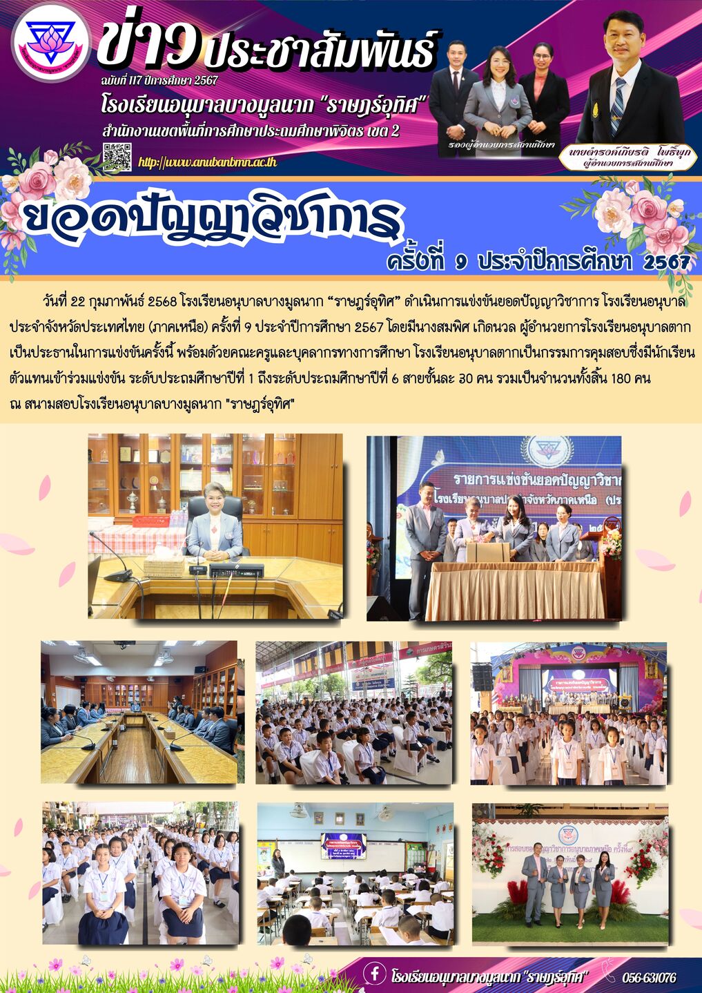 วันที่ 22 กุมภาพันธ์ 2568 โรงเรียนอนุบาลบางมูลนาก “ราษฎร์อุทิศ” ดำเนินการแข่งขันยอดปัญญาวิชาการ โรงเรียนอนุบาลประจำจังหวัดประเทศไทย (ภาคเหนือ) ครั้งที่ 9 ประจำปีการศึกษา 2567 โดยมีนางสมพิศ เกิดนวล ผู้อำนวยการโรงเรียนอนุบาลตาก เป็นประธานในการแข่งขันครั้งนี้ พร้อมด้วยคณะครูและบุคลากรทางการศึกษา โรงเรียนอนุบาลตากเป็นกรรมการคุมสอบซึ่งมีนักเรียนตัวแทนเข้าร่วมแข่งขัน ระดับประถมศึกษาปีที่ 1 ถึงระดับประถมศึกษาปีที่ 6 สายชั้นละ 30 คน รวมเป็นจำนวนทั้งสิ้น 180 คน ณ สนามสอบโรงเรียนอนุบาลบางมูลนาก "ราษฎร์อุทิศ" |