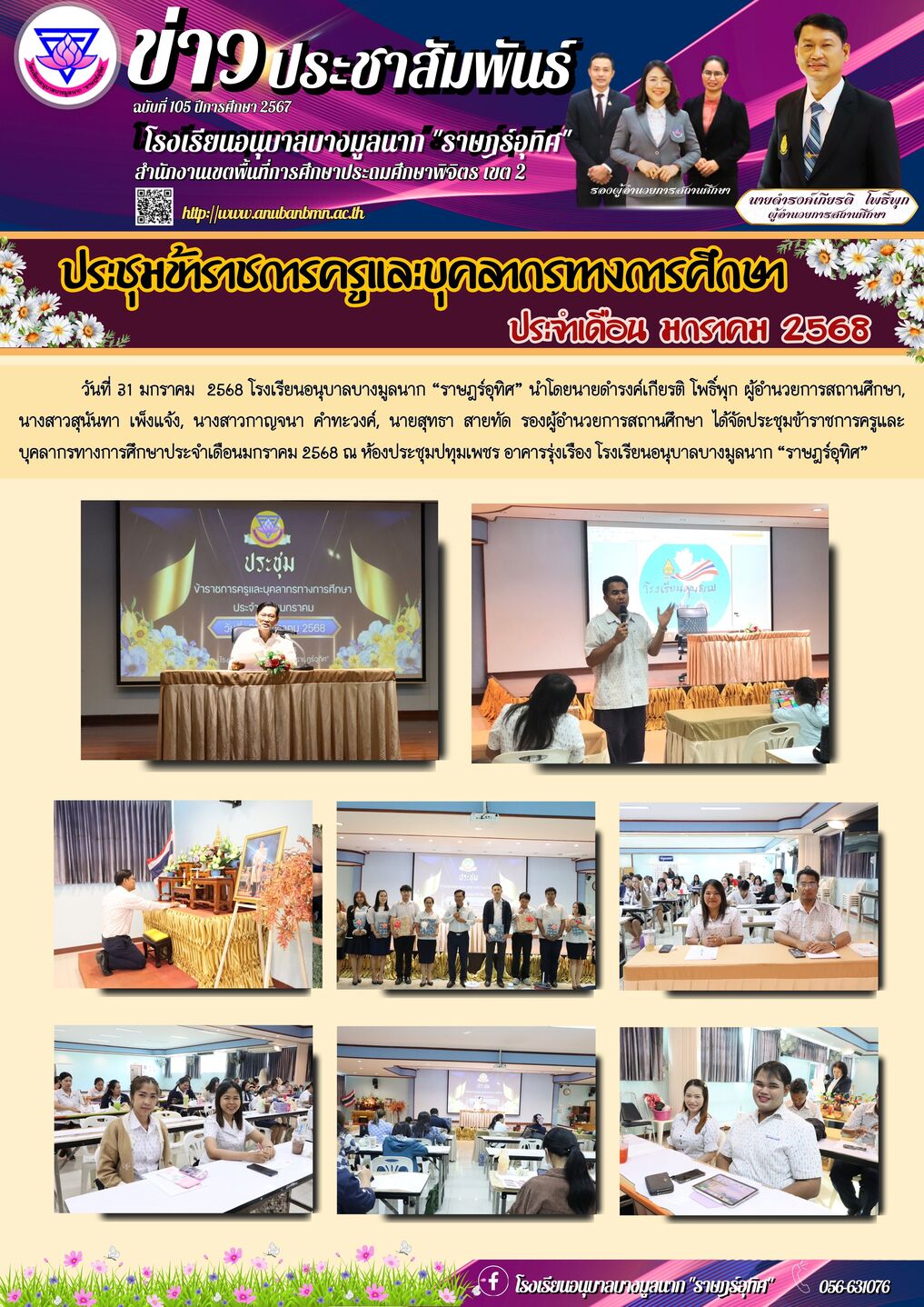 วันที่ 31 มกราคม 2568 โรงเรียนอนุบาลบางมูลนาก “ราษฎร์อุทิศ” นำโดยนายดำรงค์เกียรติ โพธิ์พุก ผู้อำนวยการสถานศึกษา, นางสาวสุนันทา เพ็งแจ้ง, นางสาวกาญจนา คำทะวงค์, นายสุทธา สายทัด รองผู้อำนวยการสถานศึกษา ได้จัดประชุมข้าราชการครูและบุคลากรทางการศึกษาประจำเดือนมกราคม 2568 ณ ห้องประชุมปทุมเพชร อาคารรุ่งเรือง โรงเรียนอนุบาลบางมูลนาก “ราษฎร์อุทิศ”