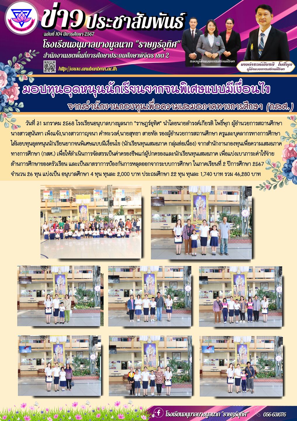 วันที่ 31 มกราคม 2568 โรงเรียนอนุบาลบางมูลนาก "ราษฎร์อุทิศ" นำโดยนายดำรงค์เกียรติ โพธิ์พุก ผู้อำนวยการสถานศึกษา นางสาวสุนันทา เพ็งแจ้ง,นางสาวกาญจนา คำทะวงค์,นายสุทธา สายทัด รองผู้อำนวยการสถานศึกษา ครูและบุคลากรทางการศึกษา ได้มอบทุนอุดหนุนนักเรียนยากจนพิเศษแบบมีเงื่อนไข (นักเรียนทุนเสมอภาค กลุ่มต่อเนื่อง) จากสำนักงานกองทุนเพื่อความเสมอภาคทางการศึกษา (กสศ.) เพื่อให้ดำเนินการจัดสรรเป็นค่าครองชีพแก่ผู้ปกครองและนักเรียนทุนเสมอภาค เพื่อแบ่งเบาภาระค่าใช้จ่ายด้านการศึกษาของครัวเรือน และเป็นมาตราการป้องกันการหลุดออกจากระบบการศึกษา ในภาคเรียนที่ 2 ปีการศึกษา 2567 จำนวน 26 ทุน แบ่งเป็น อนุบาลศึกษา 4 ทุน ทุนละ 2,000 บาท ประถมศึกษา 22 ทุน ทุนละ 1,740 บาท รวม 46,280 บาท |