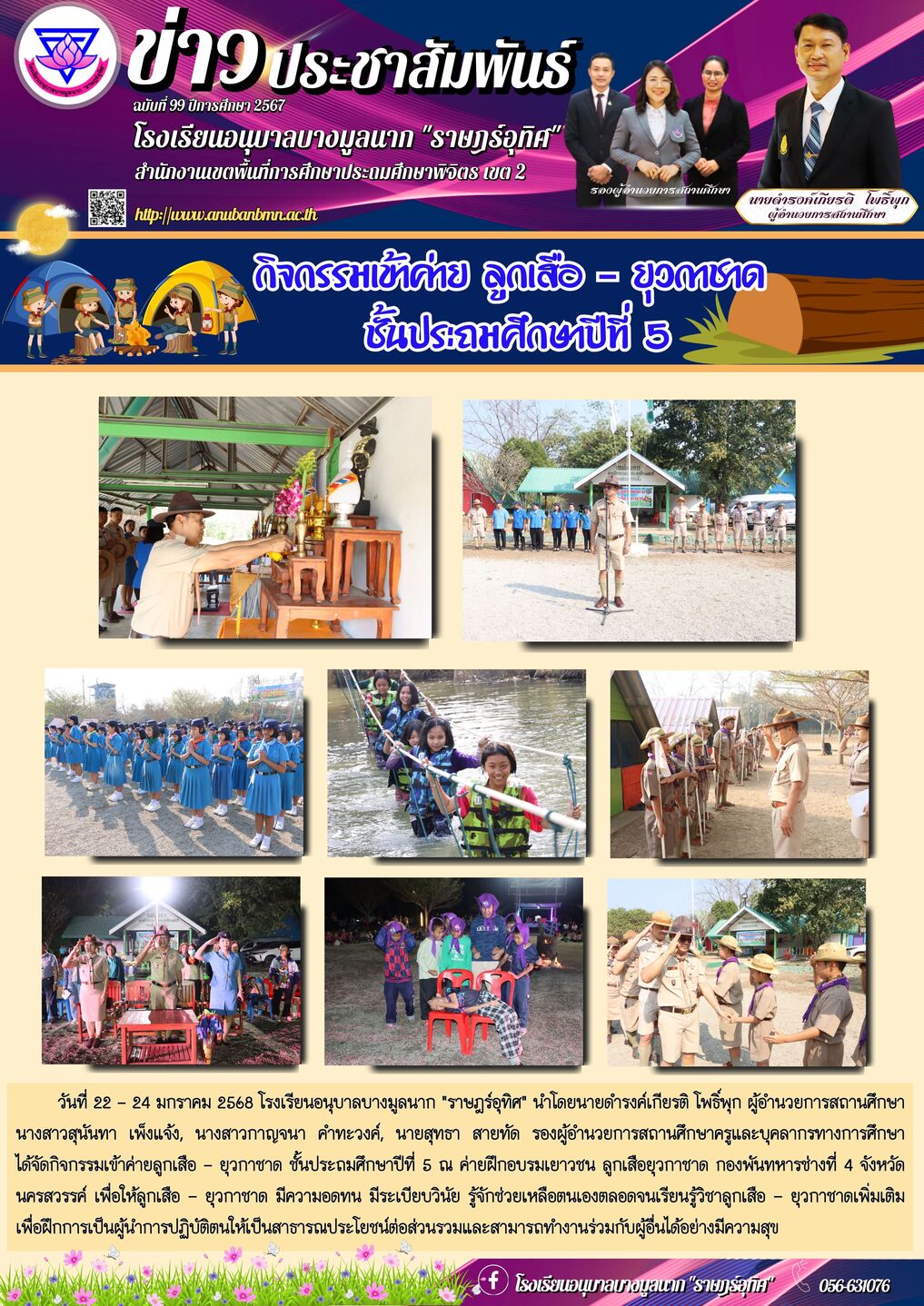 | วันที่ 22 - 24 มกราคม 2568 โรงเรียนอนุบาลบางมูลนาก "ราษฎร์อุทิศ" นำโดยนายดำรงค์เกียรติ โพธิ์พุก ผู้อำนวยการสถานศึกษา นางสาวสุนันทา เพ็งแจ้ง, นางสาวกาญจนา คำทะวงค์, นายสุทธา สายทัด รองผู้อำนวยการสถานศึกษาครูและบุคลากรทางการศึกษา ได้จัดกิจกรรมเข้าค่ายลูกเสือ - ยุวกาชาด ชั้นประถมศึกษาปีที่ 5 ณ ค่ายฝึกอบรมเยาวชน ลูกเสือยุวกาชาด กองพันทหารช่างที่ 4 จังหวัดนครสวรรค์ เพื่อให้ลูกเสือ – ยุวกาชาด มีความอดทน มีระเบียบวินัย รู้จักช่วยเหลือตนเองตลอดจนเรียนรู้วิชาลูกเสือ – ยุวกาชาดเพิ่มเติม เพื่อฝึกการเป็นผู้นำการปฏิบัติตนให้เป็นสาธารณประโยชน์ต่อส่วนรวมและสามารถทำงานร่วมกับผู้อื่นได้อย่างมีความสุข |