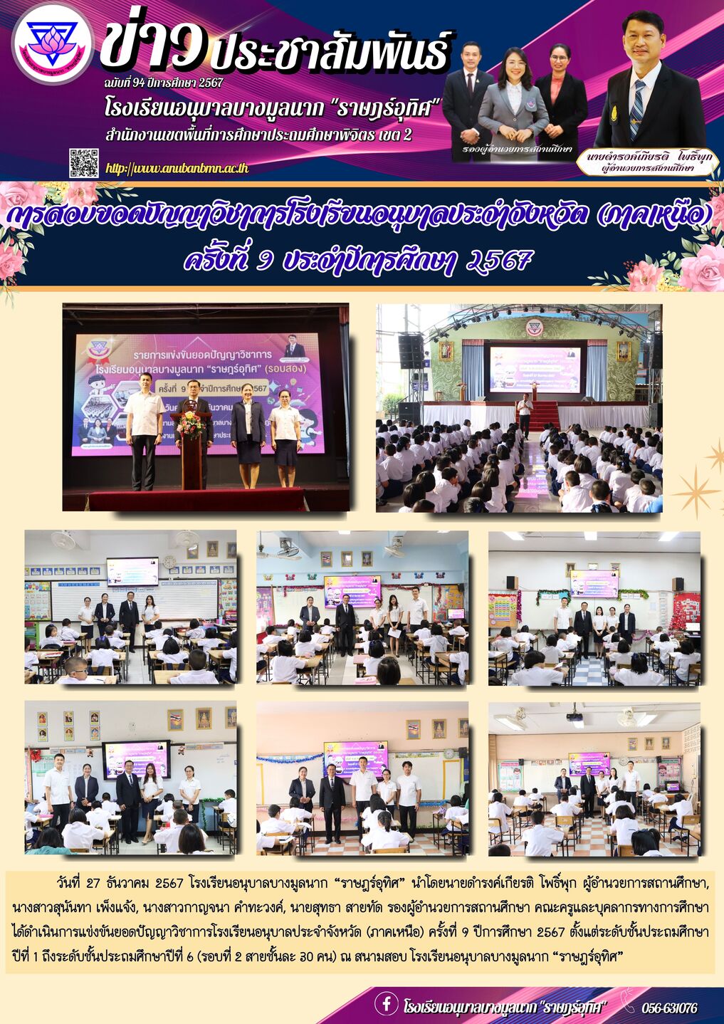 | วันที่ 27 ธันวาคม 2567 โรงเรียนอนุบาลบางมูลนาก “ราษฎร์อุทิศ” นำโดยนายดำรงค์เกียรติ โพธิ์พุก ผู้อำนวยการสถานศึกษา, นางสาวสุนันทา เพ็งแจ้ง, นางสาวกาญจนา คำทะวงค์, นายสุทธา สายทัด รองผู้อำนวยการสถานศึกษา คณะครูและบุคลากรทางการศึกษา ได้ดำเนินการแข่งขันยอดปัญญาวิชาการโรงเรียนอนุบาลประจำจังหวัด (ภาคเหนือ) ครั้งที่ 9 ปีการศึกษา 2567 ตั้งแต่ระดับชั้นประถมศึกษาปีที่ 1 ถึงระดับชั้นประถมศึกษาปีที่ 6 (รอบที่ 2 สายชั้นละ 30 คน) ณ สนามสอบ โรงเรียนอนุบาลบางมูลนาก “ราษฎร์อุทิศ” |