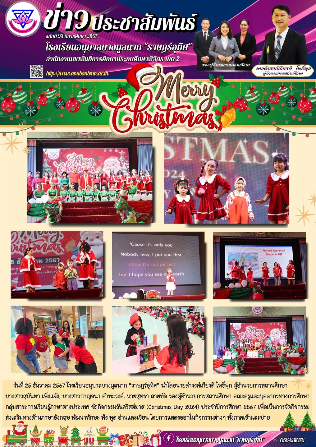 วันที่ 25 ธันวาคม 2567 โรงเรียนอนุบาลบางมูลนาก “ราษฎร์อุทิศ” นำโดยนายดำรงค์เกียรติ โพธิ์พุก ผู้อำนวยการสถานศึกษา, นางสาวสุนันทา เพ็งแจ้ง, นางสาวกาญจนา คำทะวงค์, นายสุทธา สายทัด รองผู้อำนวยการสถานศึกษา คณะครูและบุคลากรทางการศึกษา กลุ่มสาระการเรียนรู้ภาษาต่างประเทศ จัดกิจกรรมวันคริสต์มาส (Christmas Day 2024) ประจำปีการศึกษา 2567 เพื่อเป็นการจัดกิจกรรมส่งเสริมทางด้านภาษาอังกฤษ พัฒนาทักษะ ฟัง พูด อ่านและเขียน โดยการแสดงออกในกิจกรรมต่างๆ ทั้งภาคเช้าและบ่าย |