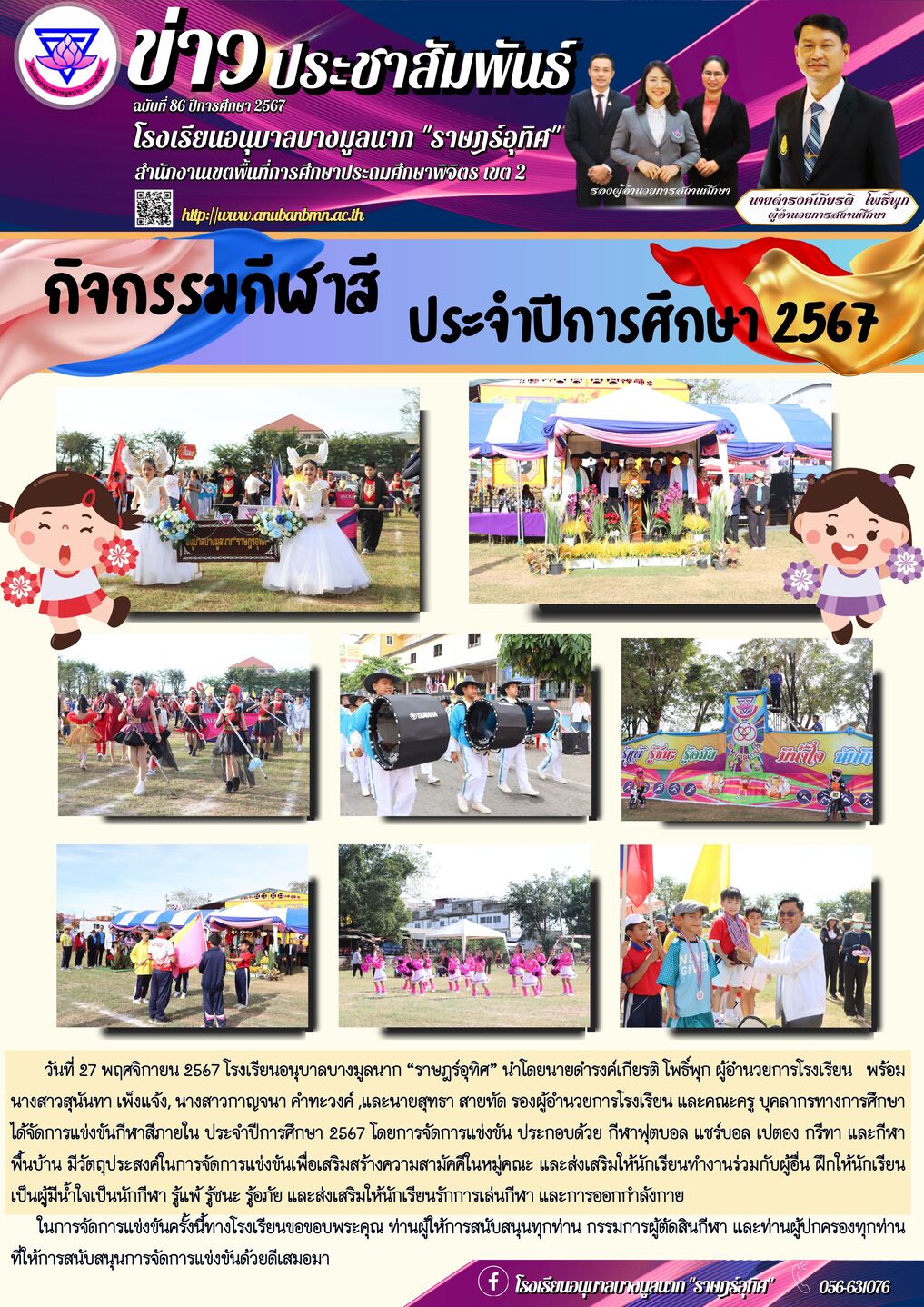 วันที่ 27 พฤศจิกายน 2567 โรงเรียนอนุบาลบางมูลนาก “ราษฎร์อุทิศ” นำโดยนายดำรงค์เกียรติ โพธิ์พุก ผู้อำนวยการโรงเรียน พร้อมนางสาวสุนันทา เพ็งแจ้ง, นางสาวกาญจนา คำทะวงค์ ,และนายสุทธา สายทัด รองผู้อำนวยการโรงเรียน และคณะครู บุคลากรทางการศึกษา ได้จัดการแข่งขันกีฬาสีภายใน ประจำปีการศึกษา 2567 โดยการจัดการแข่งขัน ประกอบด้วย กีฬาฟุตบอล แชร์บอล เปตอง กรีฑา และกีฬาพื้นบ้าน มีวัตถุประสงค์ในการจัดการแข่งขันเพื่อเสริมสร้างความสามัคคีในหมู่คณะ และส่งเสริมให้นักเรียนทำงานร่วมกับผู้อื่น ฝึกให้นักเรียนเป็นผู้มีน้ำใจเป็นนักกีฬา รู้แพ้ รู้ชนะ รู้อภัย และส่งเสริมให้นักเรียนรักการเล่นกีฬา และการออกกำลังกาย ในการจัดการแข่งขันครั้งนี้ทางโรงเรียนขอขอบพระคุณ ท่านผู้ให้การสนับสนุนทุกท่าน กรรมการผู้ตัดสินกีฬา และท่านผู้ปกครองทุกท่าน ที่ให้การสนับสนุนการจัดการแข่งขันด้วยดีเสมอมา |