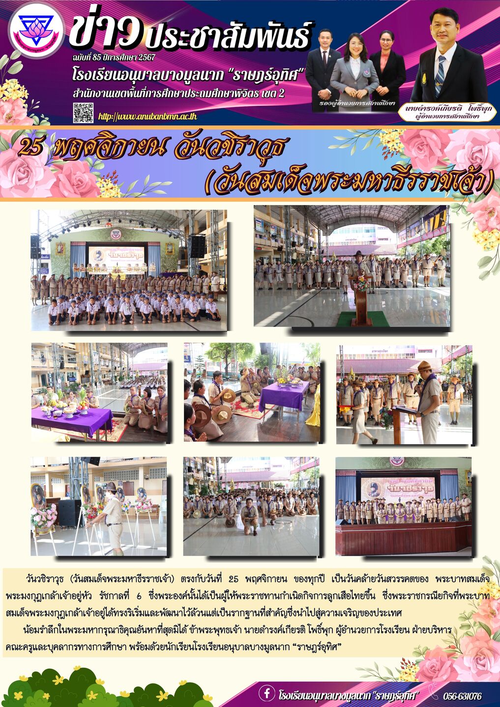 วันวชิราวุธ (วันสมเด็จพระมหาธีรราชเจ้า) ตรงกับวันที่ 25 พฤศจิกายน ของทุกปี เป็นวันคล้ายวันสวรรคตของ พระบาทสมเด็จพระมงกุฎเกล้าเจ้าอยู่หัว รัชกาลที่ 6 ซึ่งพระองค์นั้นได้เป็นผู้ให้พระราชทานกำเนิดกิจการลูกเสือไทยขึ้น ซึ่งพระราชกรณียกิจที่พระบาทสมเด็จพระมงกุฎเกล้าเจ้าอยู่ได้ทรงริเริ่มและพัฒนาไว้ล้วนแต่เป็นรากฐานที่สำคัญซึ่งนำไปสู่ความเจริญของประเทศ น้อมรำลึกในพระมหากรุณาธิคุณอันหาที่สุดมิได้ ข้าพระพุทธเจ้า นายดำรงค์เกียรติ โพธิ์พุก ผู้อำนวยการโรงเรียน ฝ่ายบริหาร คณะครูและบุคลากรทางการศึกษา พร้อมด้วยนักเรียนโรงเรียนอนุบาลบางมูลนาก “ราษฎร์อุทิศ” |