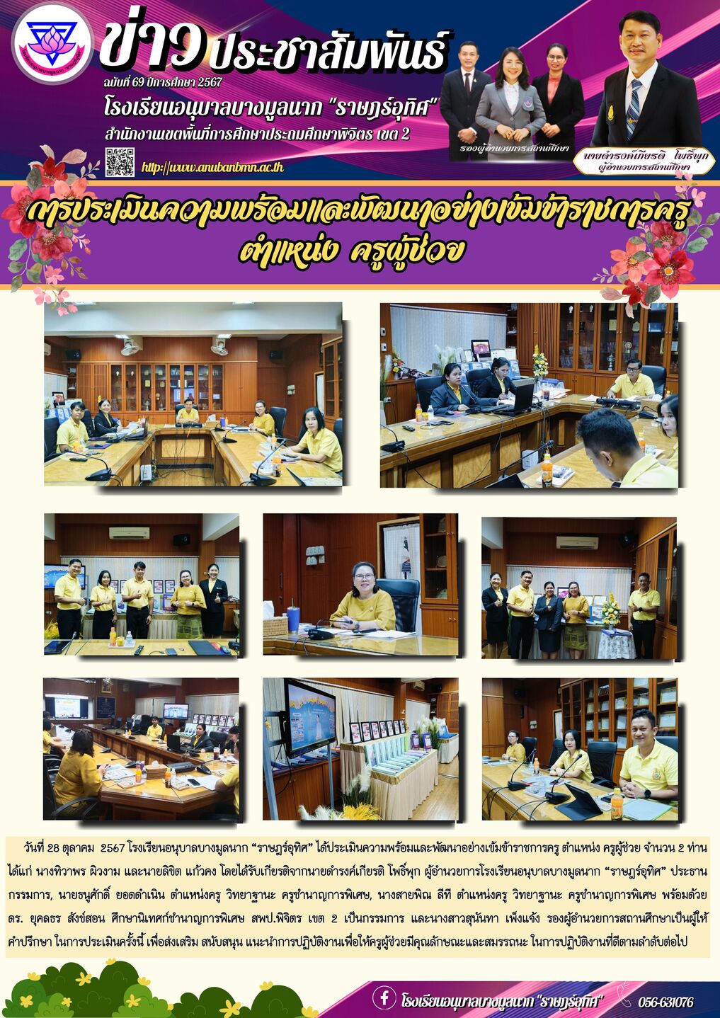 | วันที่ 28 ตุลาคม 2567 โรงเรียนอนุบาลบางมูลนาก “ราษฎร์อุทิศ” ได้ประเมินความพร้อมและพัฒนาอย่างเข้มข้าราชการครู ตำแหน่ง ครูผู้ช่วย จำนวน 2 ท่าน ได้แก่ นางทิวาพร ผิวงาม และนายลิขิต แก้วคง โดยได้รับเกียรติจากนายดำรงค์เกียรติ โพธิ์พุก ผู้อำนวยการโรงเรียนอนุบาลบางมูลนาก “ราษฎร์อุทิศ” ประธานกรรมการ, นายธนูศักดิ์ ยอดดำเนิน ตำแหน่งครู วิทยาฐานะ ครูชำนาญการพิเศษ, นางสายพิณ ลีที ตำแหน่งครู วิทยาฐานะ ครูชำนาญการพิเศษ พร้อมด้วย ดร. ยุคลธร สังข์สอน ศึกษานิเทศก์ชำนาญการพิเศษ สพป.พิจิตร เขต 2 เป็นกรรมการ และนางสาวสุนันทา เพ็งแจ้ง รองผู้อำนวยการสถานศึกษาเป็นผู้ให้ คำปรึกษา ในการประเมินครั้งนี้ เพื่อส่งเสริม สนับสนุน แนะนำการปฏิบัติงานเพื่อให้ครูผู้ช่วยมีคุณลักษณะและสมรรถนะ ในการปฏิบัติงานที่ดีตามลำดับต่อไป |