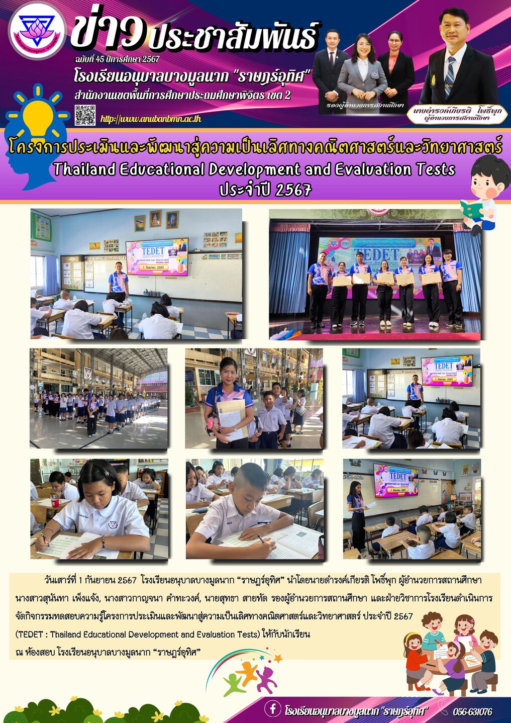 วันเสาร์ที่ 1 กันยายน 2567 โรงเรียนอนุบาลบางมูลนาก “ราษฎร์อุทิศ” นำโดยนายดำรงค์เกียรติ โพธิ์พุก ผู้อำนวยการสถานศึกษา นางสาวสุนันทา เพ็งแจ้ง, นางสาวกาญจนา คำทะวงค์, นายสุทธา สายทัด รองผู้อำนวยการสถานศึกษา และฝ่ายวิชาการโรงเรียนดำเนินการจัดกิจกรรมทดสอบความรู้โครงการประเมินและพัฒนาสู่ความเป็นเลิศทางคณิตศาสตร์และวิทยาศาสตร์ ประจำปี 2567 (TEDET : Thailand Educational Development and Evaluation Tests) ให้กับนักเรียน ณ ห้องสอบ โรงเรียนอนุบาลบางมูลนาก “ราษฎร์อุทิศ” |