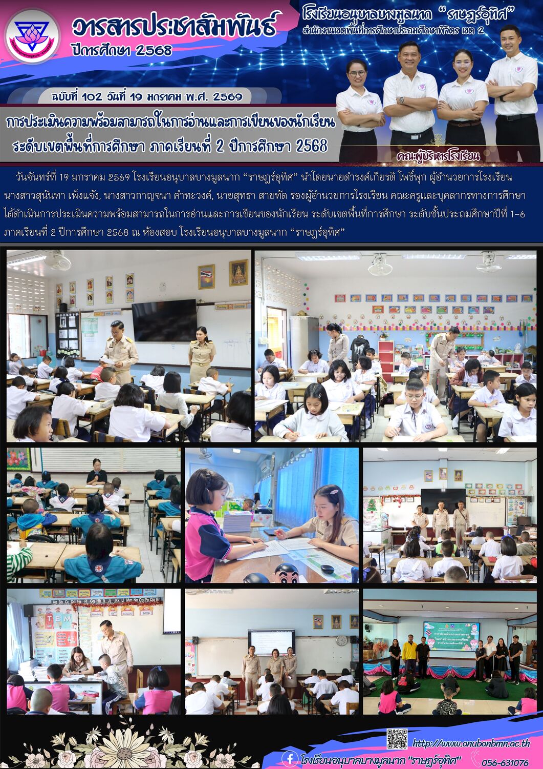 วันจันทร์ที่ 19 มกราคม 2569 โรงเรียนอนุบาลบางมูลนาก “ราษฎร์อุทิศ” นำโดยนายดำรงค์เกียรติ โพธิ์พุก ผู้อำนวยการโรงเรียน นางสาวสุนันทา เพ็งแจ้ง, นางสาวกาญจนา คำทะวงค์, นายสุทธา สายทัด รองผู้อำนวยการโรงเรียน คณะครูและบุคลากรทางการศึกษา ได้ดำเนินการประเมินความพร้อมสามารถในการอ่านและการเขียนของนักเรียน ระดับเขตพื้นที่การศึกษา ระดับชั้นประถมศึกษาปีที่ 1-6 ภาคเรียนที่ 2 ปีการศึกษา 2568 ณ ห้องสอบ โรงเรียนอนุบาลบางมูลนาก “ราษฎร์อุทิศ” |